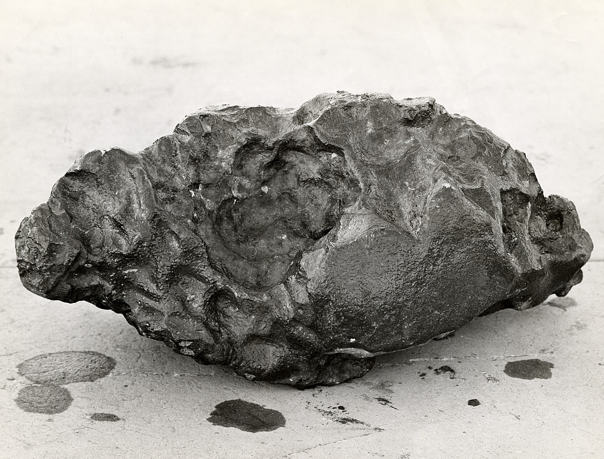 Photograph of the Loreto, Baja California Sur, Mexico, meteorite brought back by Harvey Harlow Nininger (1887-1986). Through Stuart H. Perry (1874-1957), a newspaper publisher and authority on meteorites, who made extensive collections of meteorites, the Loreto meteorite and many other specimens were donated to the United States National Museum (USNM). The Loreto meteorite, a find of 1896, was originally approximately 95 kg. The main mass of 90 kg is now in Smithsonian Institution's collection. Modest amounts were distributed to other major collections.
