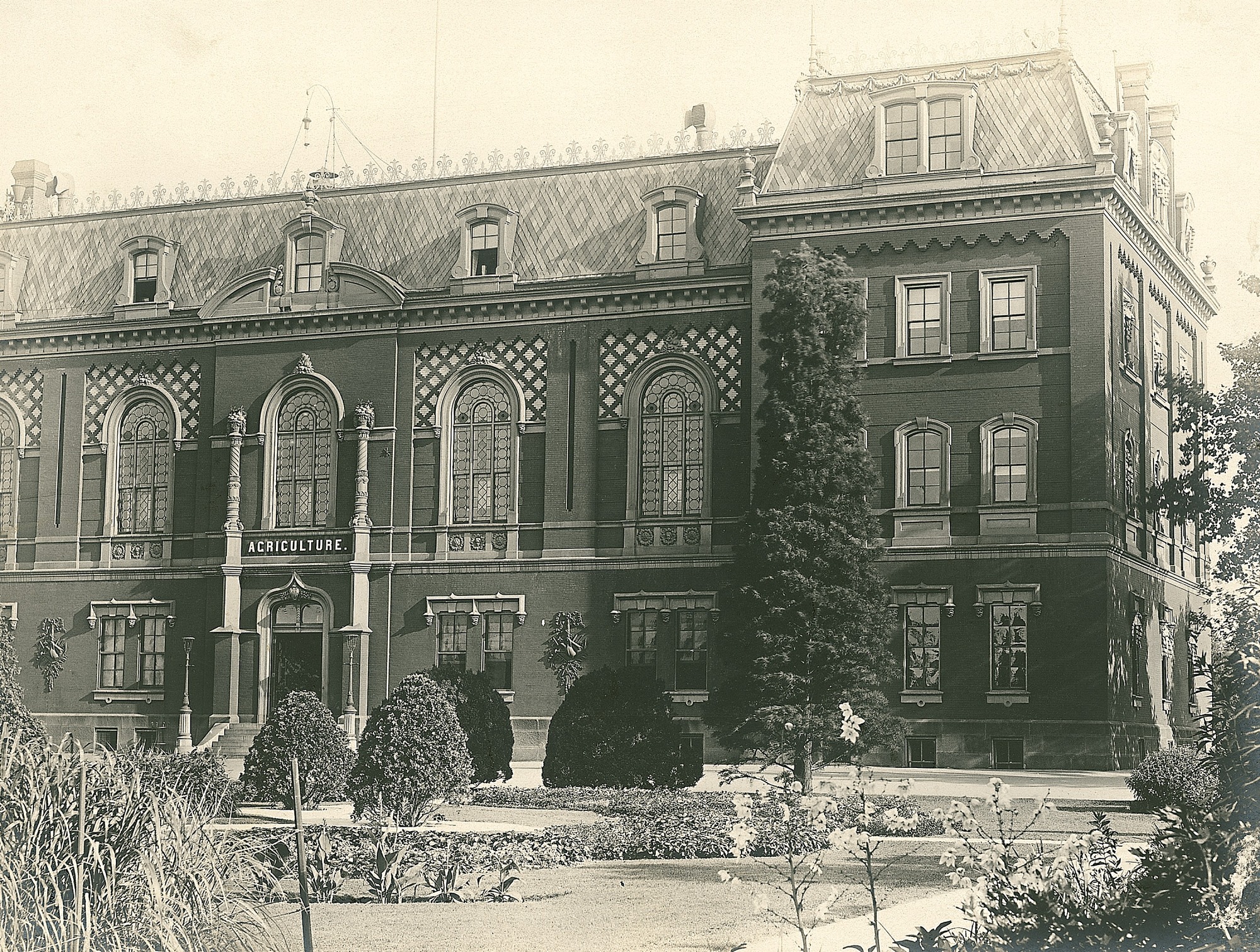 The United States Department of Agriculture's old brick building with Mansard roof as viewed from the Mall was completed in 1867 and torn down in 1930.