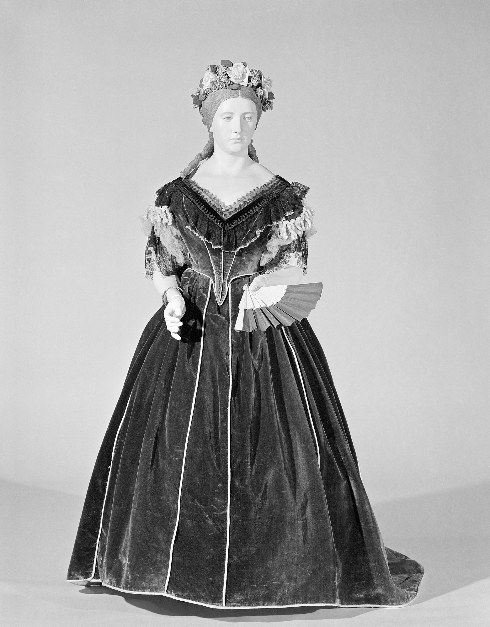 Mary Todd Lincoln (1818-1882), wife of President Abraham Lincoln is dressed in a gown of royal purple velvet with a tight bodice and full skirt of the hoop-skirt period. The seams of the dress, skirt, and bodice, the hem of the skirt, and the bottom of the bodice are piped with narrow white-satin cord. The neck is trimmed with an elaborate fichu of black Alencon lace with a white edge, and a bouquet of pansies is placed at her bosom. The short puffed sleeves are made of white net and Alencon lace. The fan is purple taffeta. The dress is part of the First Ladies Collection at the National Museum of American History.