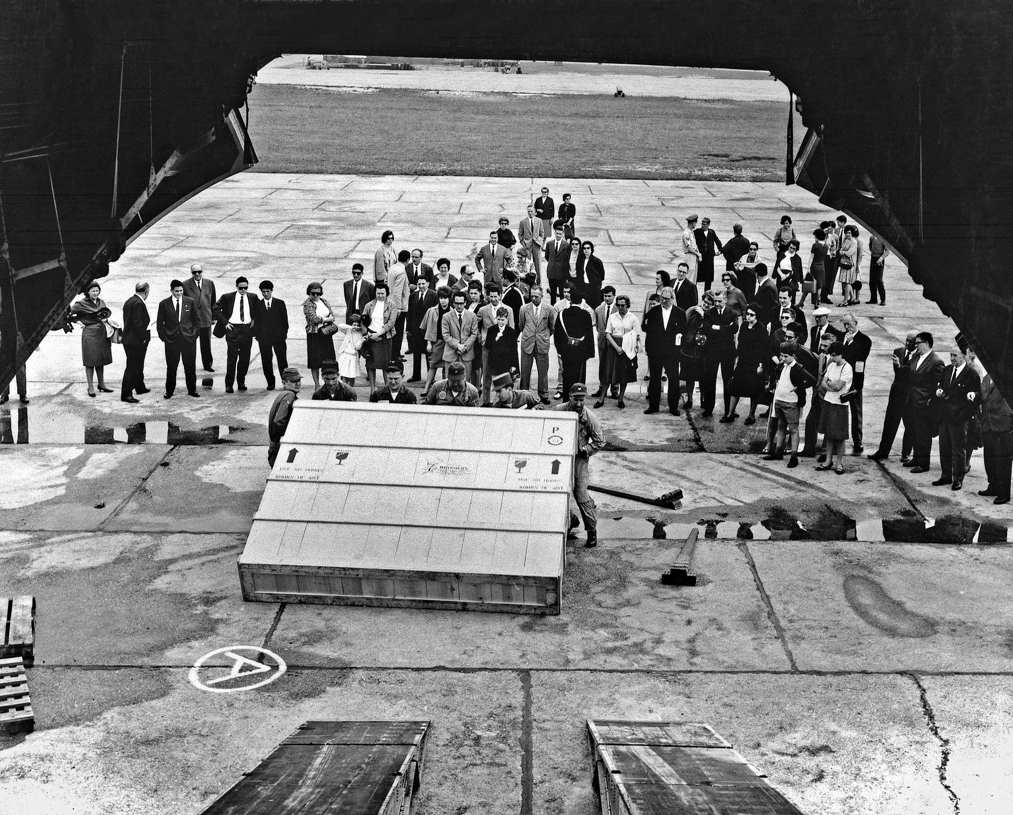 A large group of people have gathered to watch the unloading of a crate containing a painting by Jasper Johns at the XXXII Venice Biennial, Venice, Italy. The National Museum of American Art, Office of Program Support, sent work to International Exhibitions. The U.S. Information Agency organized and circulated art exhibitions abroad and, in the years immediately preceding 1965, supported American participation in international art shows. Johns was an American painter whose paintings often were of maps, flags and targets.