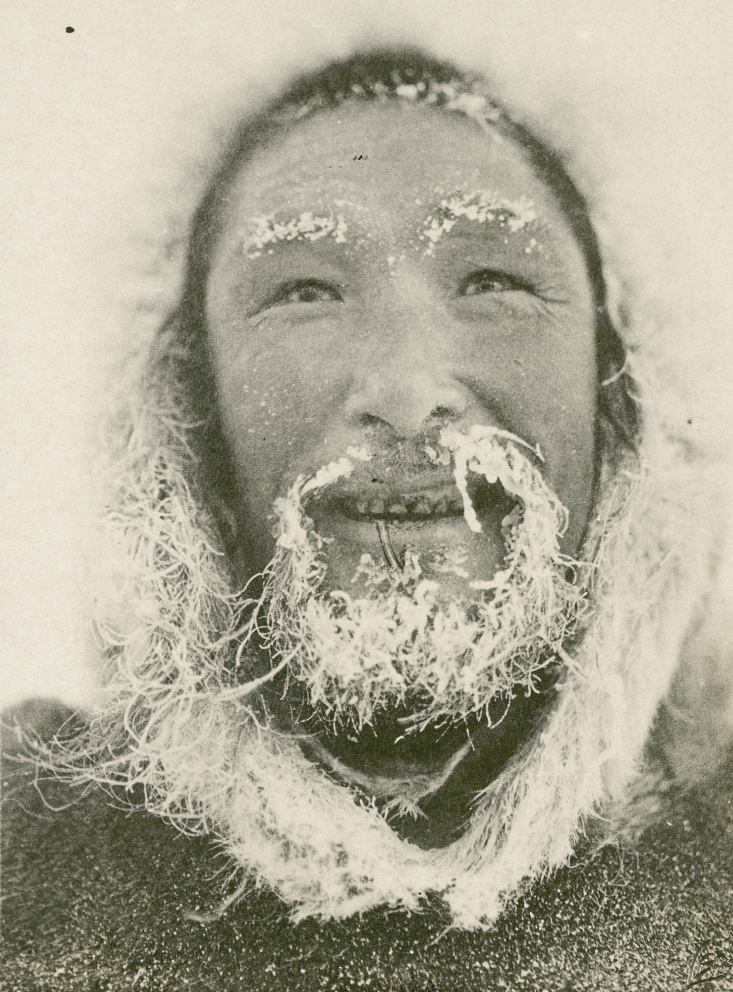 A man from the Umingmaktormiut, an Eskimo tribe that before Rasmussen's visit had never been described or photgraphed. Note the hoarfrost on his beard.