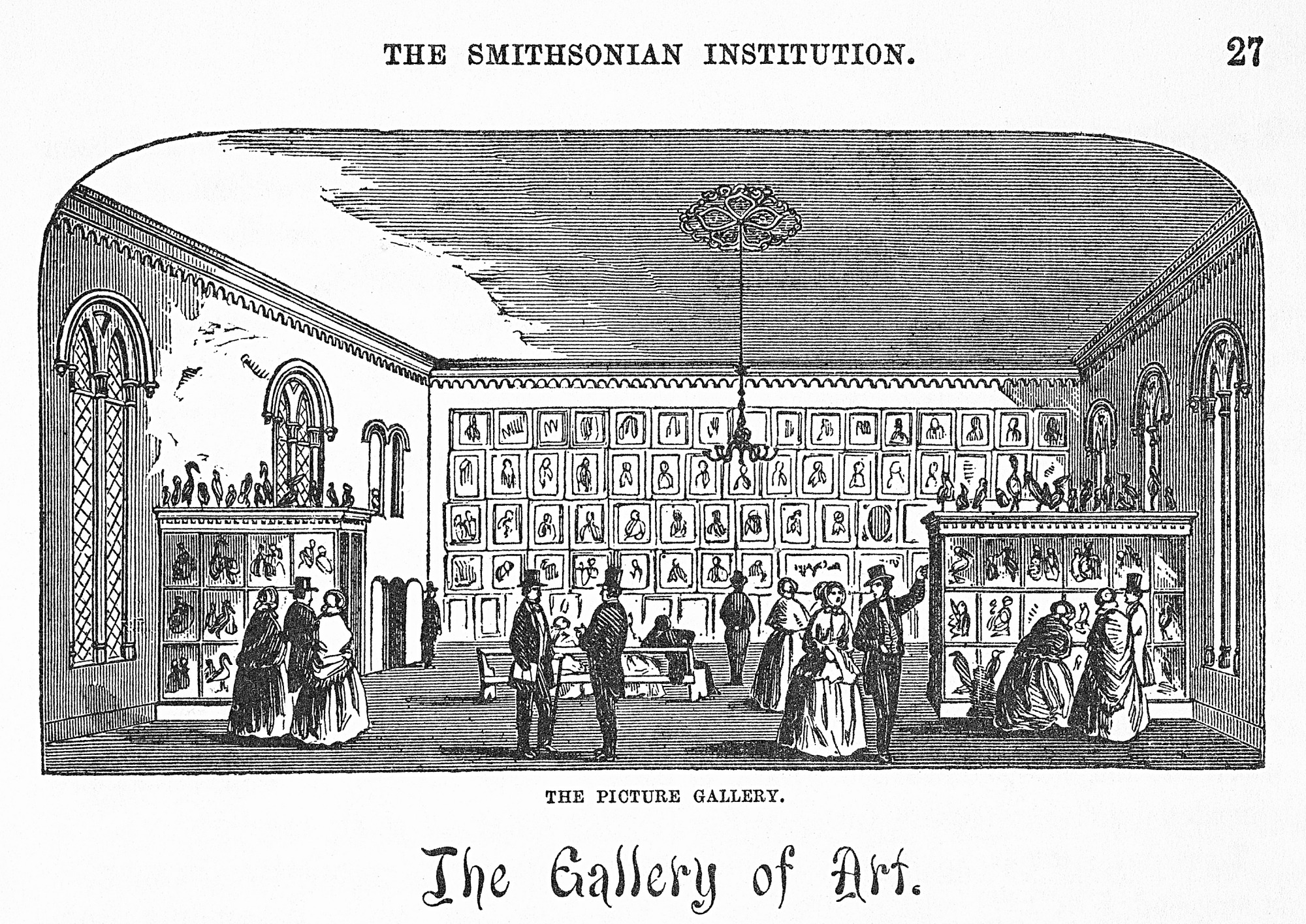 Engraving of the Gallery of Art above the Great Hall in the Smithsonian Institution Building (SIB), or "Castle," c.1857. This pre-fire engraving entitled, "The Picture Gallery," shows people browsing a room laden with portraits. The engraving was published in the Guidebook of 1857.