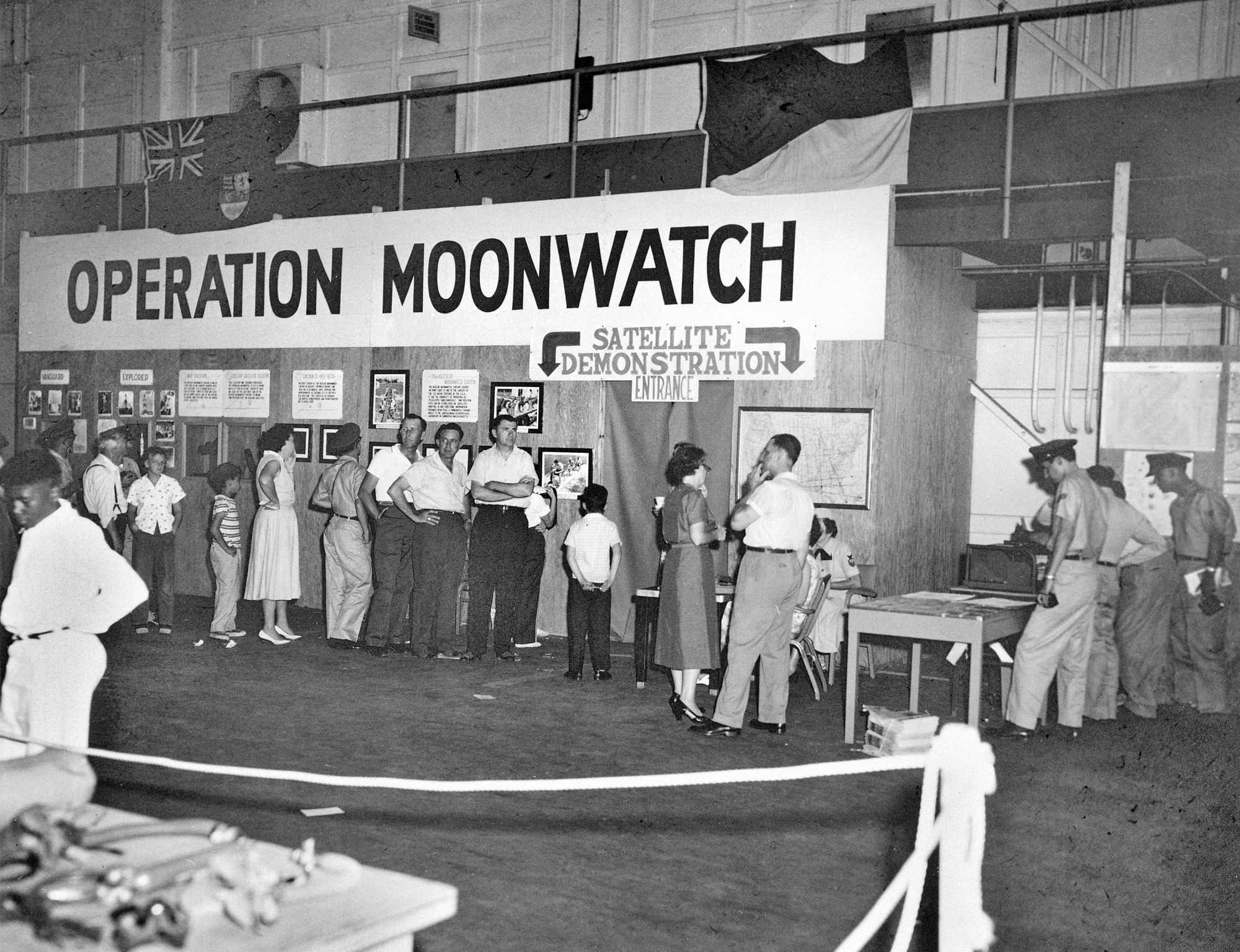 Under a banner for Operation Moonwatch, people are lined up at the entrance to a Satellite Demonstration set up in Biloxi, Mississippi. The Moonwatch Division of the Smithsonian Astrophysical Observatory was created in 1956 as part of the Satellite Tracking Program and established to track and photograph the artificial earth satellites to be launched during the International Geophysical Year, 1957-1958.