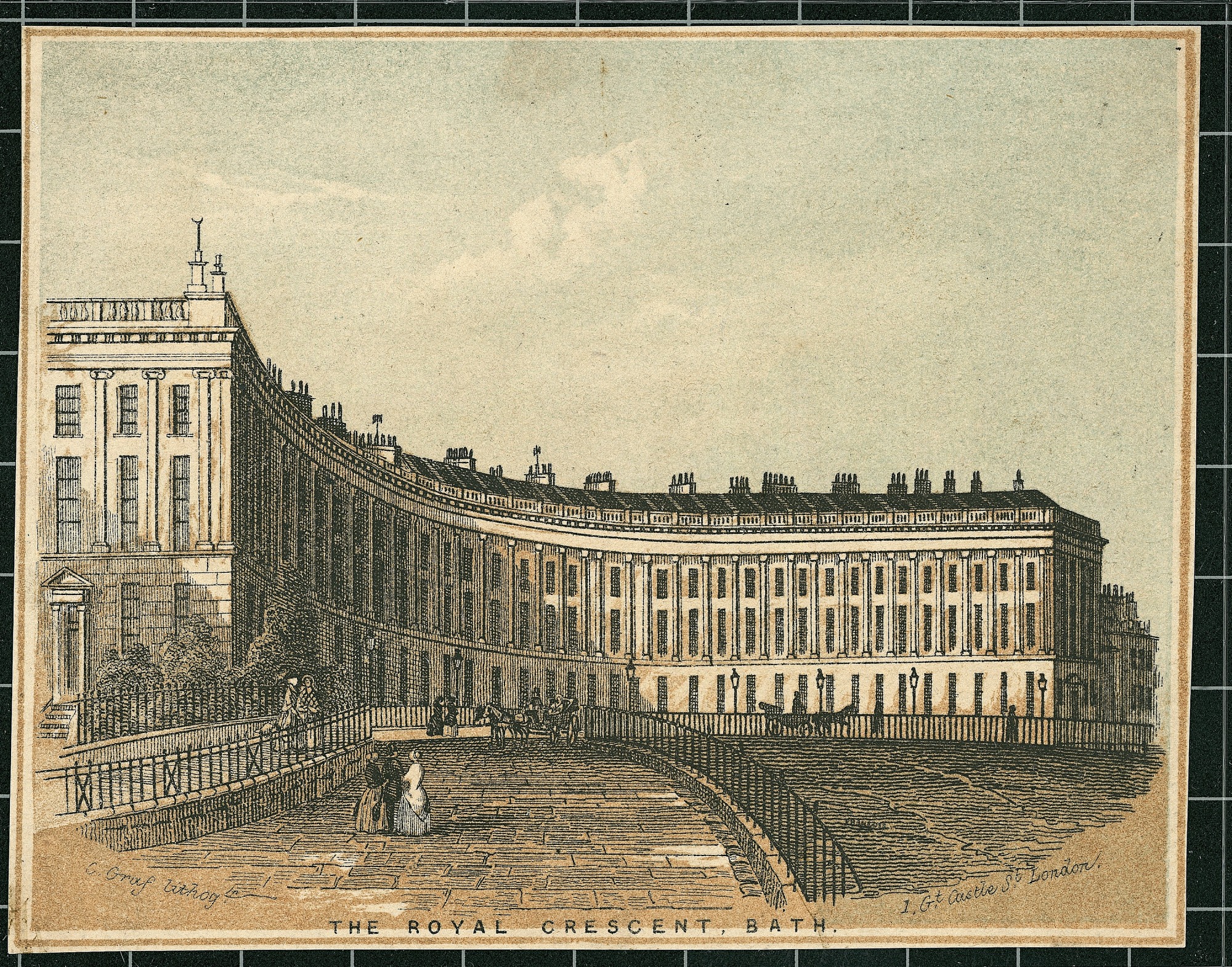 This is a view of the building called the Royal Crescent, Bath in 1768. The grandest of Bath's many Georgian crescents, the Royal Crescent was built by John Wood the Younger between 1767 and 1774. It consists of thirty elegant mansions of freestone, uniformly built. Columns of the Ionic order, rising from a rustic basement, support the superior cornice, and the stately fronts of the houses at each end, add greatly to the general effect. James Smithson's mother, Elizabeth Hungerford Keate Macie, was from the nearby town of Weston and Mrs. Macie in 1761 enjoyed the freedom of widowhood and the elaborate social life of Bath. Bath was the favorite playground in England for the upper class. It is suspected that this is where she met and had an affair with Sir Hugh Smithson. The affair led to the birth c. 1765 of James Smithson, founding donor of the Smithsonian Institution.