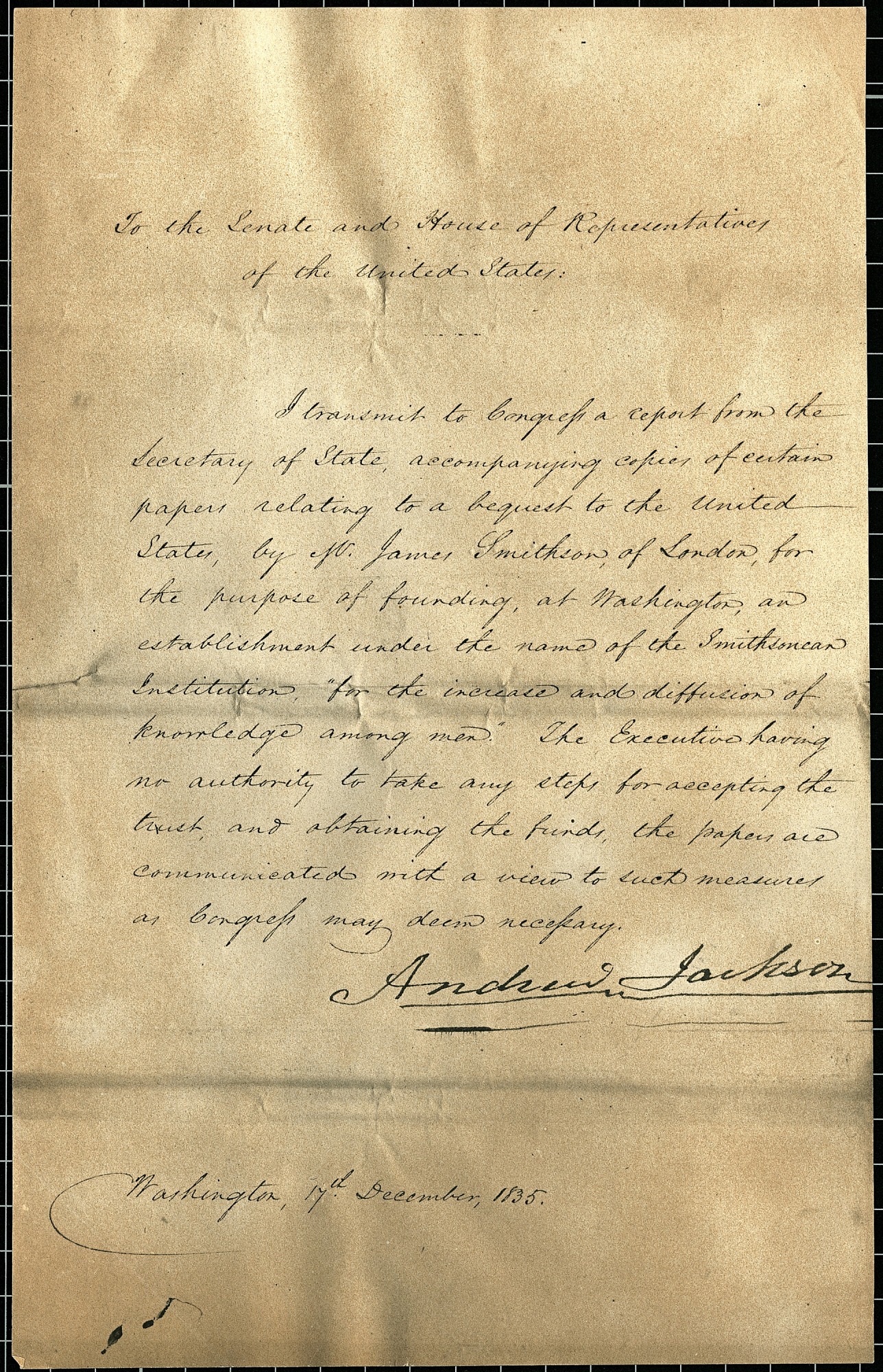 Letter by President Andrew Jackson to the United States Congress informs them that as president he has no authority to take any steps for accepting James Smithson's bequest but instructs Congress to take such measures as they deem necessary to accept the funds.