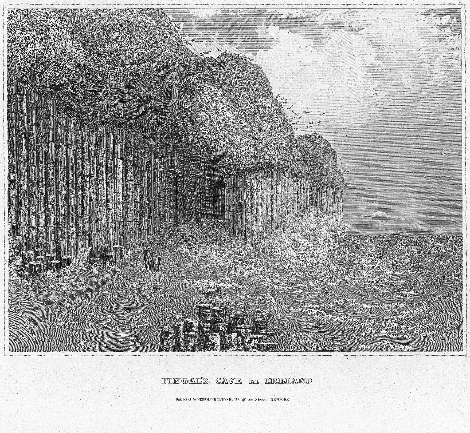 Lithograph of Fingal's Cave in Ireland. The lithograph was published for Hermann J. Meyer of 164 William Street in New York
