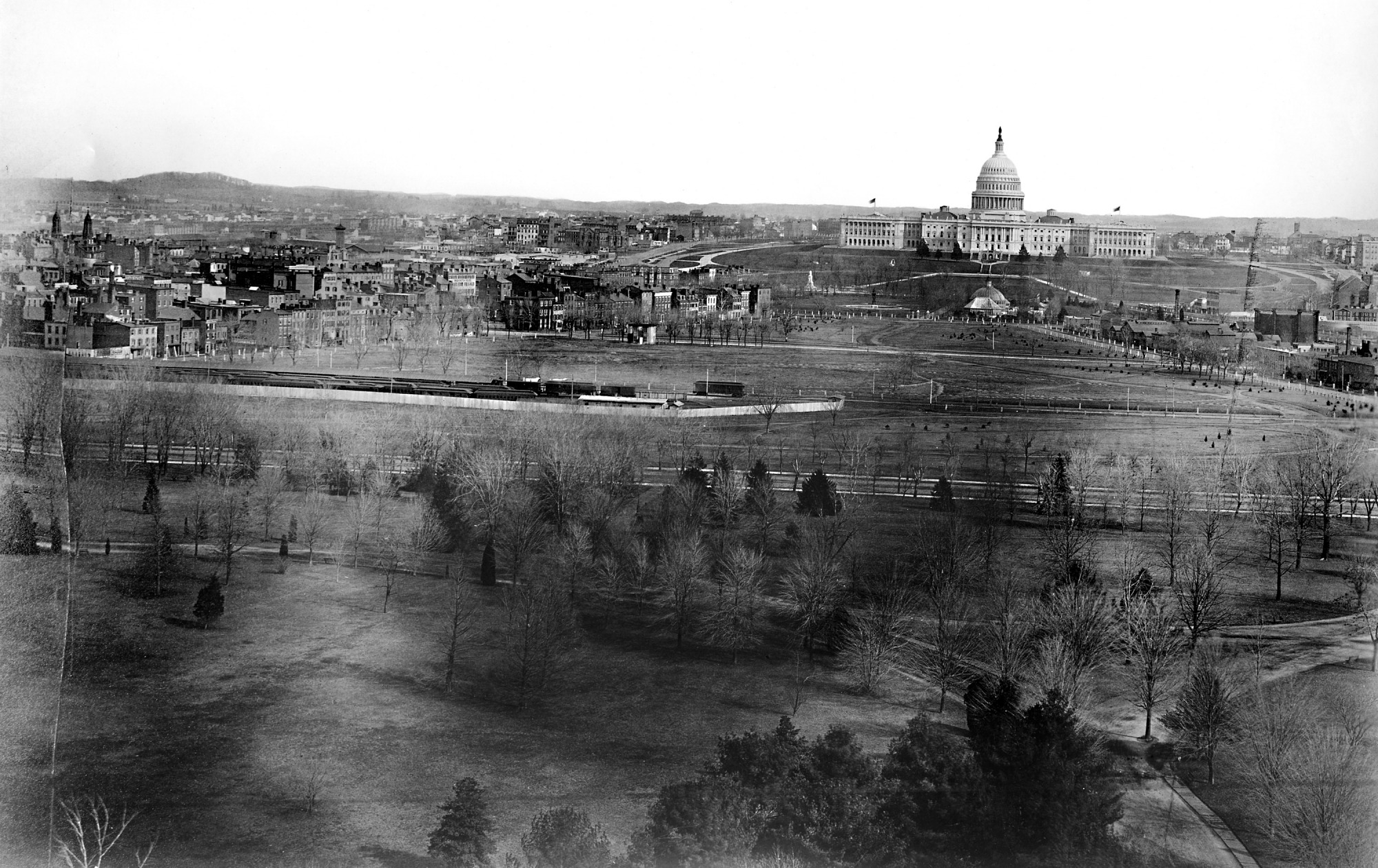 Looking toward the west side of the United States Capitol building, a panoramic view of the city of Washington, D.C. shows the Mall area in the foreground before the railroad tracks were removed. A train is visible on the tracks. The domed structure in front of the Capitol is the Botanic Garden original octagonal greenhouse of 1859 and behind it the central pavilion added after the Civil War. The buildings were razed in 1932. The Botanic Garden was on a site previously occupied by the Columbian Institute for the Promotion of Arts and Sciences in Washington, D.C.