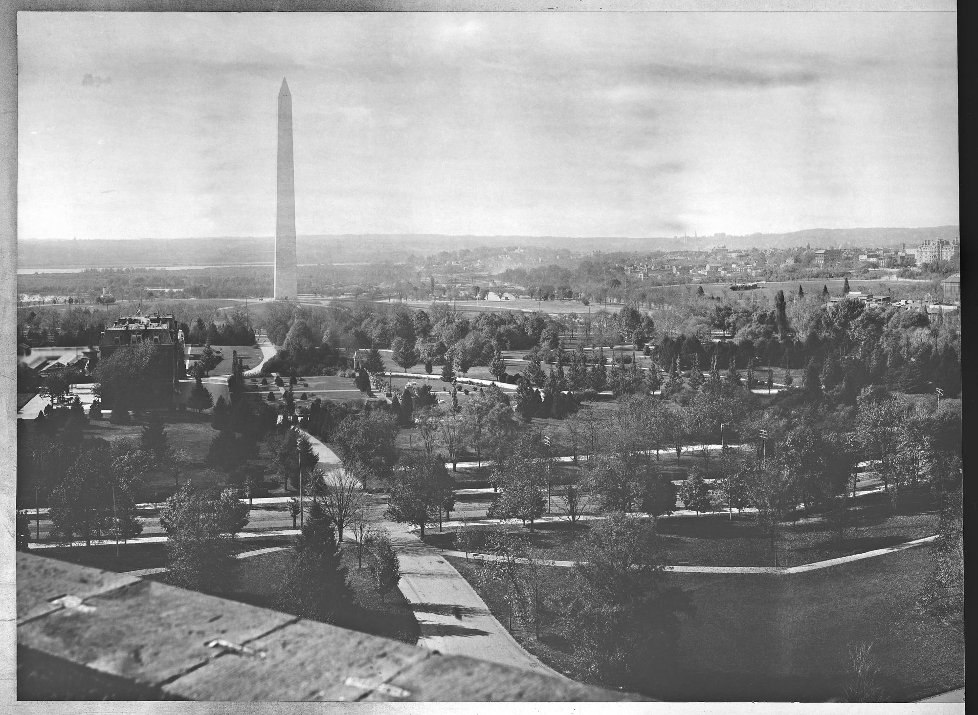 First in a series of four panoramic photographs of Washington, D.C., from left to right taken from a tower in the Smithsonian Institution Building. Looking toward the Washington Monument, the street in the foreground running from left to right is 12th Street, N.W., which was later tunneled under the Mall. The old Department of Agriculture Building is visible on the left beside 14th Street, N.W. The large grassy area on the right is the Ellipse.
