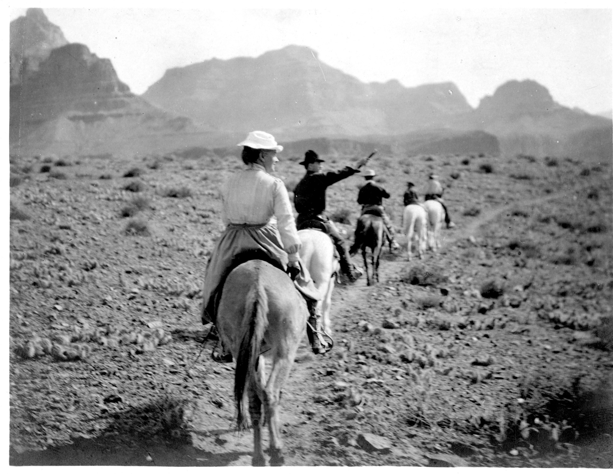 The Walcott family on a field trip in the Grand Canyon, Arizona. Included are family members Charles D. Walcott, wife Helena B. S. Walcott, and sons Sidney and Charles, Jr. All are riding horses.