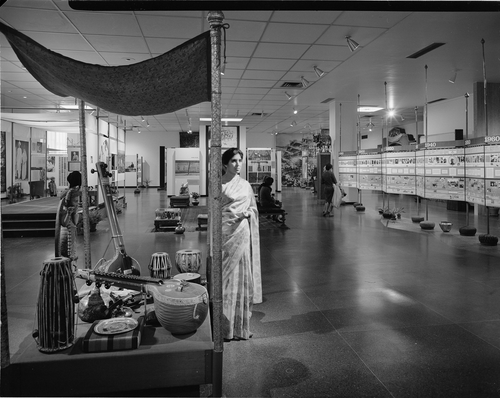 View is of traveling exhibition designed by Charles and Ray Eames, titled "Jawaharlal Nehru: His Life and His India," on display at the new Museum of History and Technology, now known as National Museum of American History, from October 26, 1965, to January 2, 1966. A guide dressed in a sari stands beside a case holding musical instruments. A visitor on the right is looking at an exhibit. Two people sit on a bench.