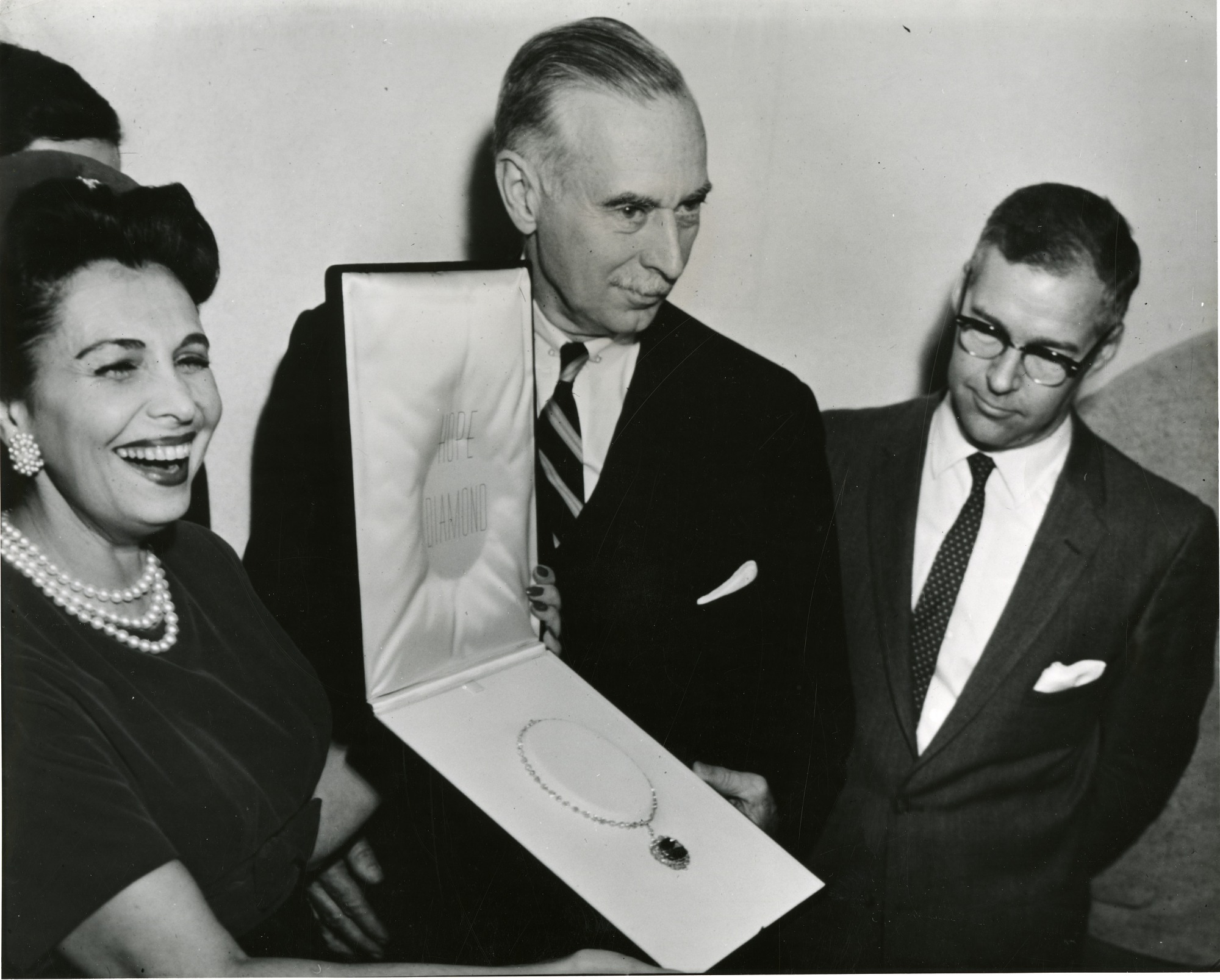 Mrs. Edna Winston, wife of Harry Winston, presenting the Hope Diamond to Secretary Leonard Carmichael and Curator George Switzer on November 10, 1958.