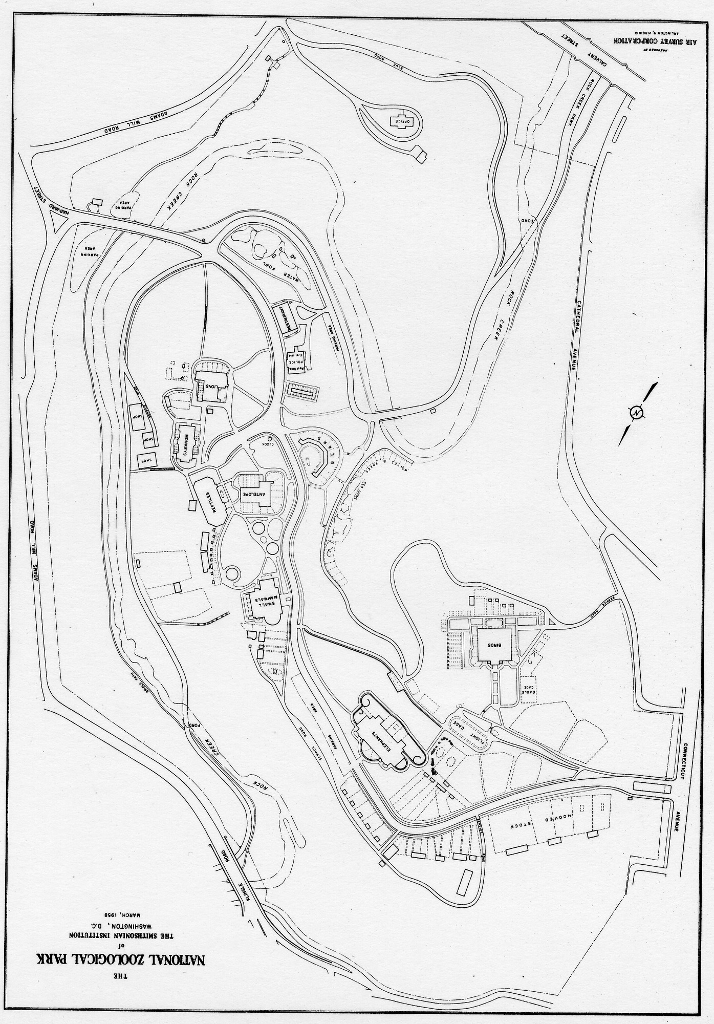 A map of National Zoological Park shows the location of numerous zoo buildings, some of which are identified, as well as the adjacent Rock Creek and city streets.