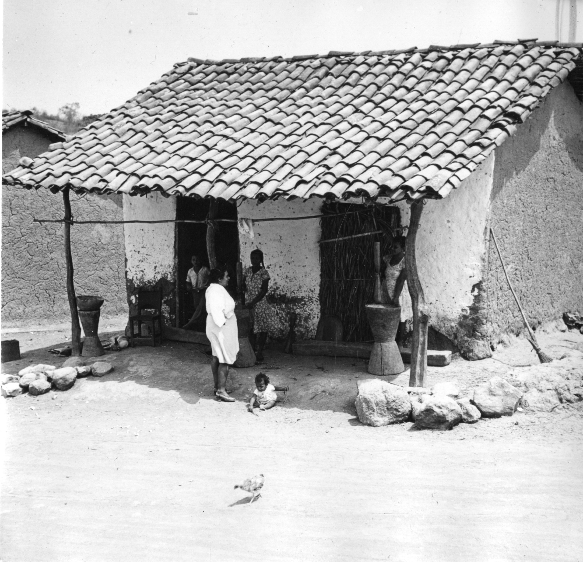 Image of citizens of the town of La Palma, Los Santos, Panama, including a small child on the ground, an older woman by a post, a young girl by a pedestal, and a child in the doorway. The group is standing under a roof overhang supported by wood posts in front of a house. The image was taken by sixth Smithsonian Secretary and ornithologist, Alexander Wetmore, while on one of his many ornithological expeditions to the country.