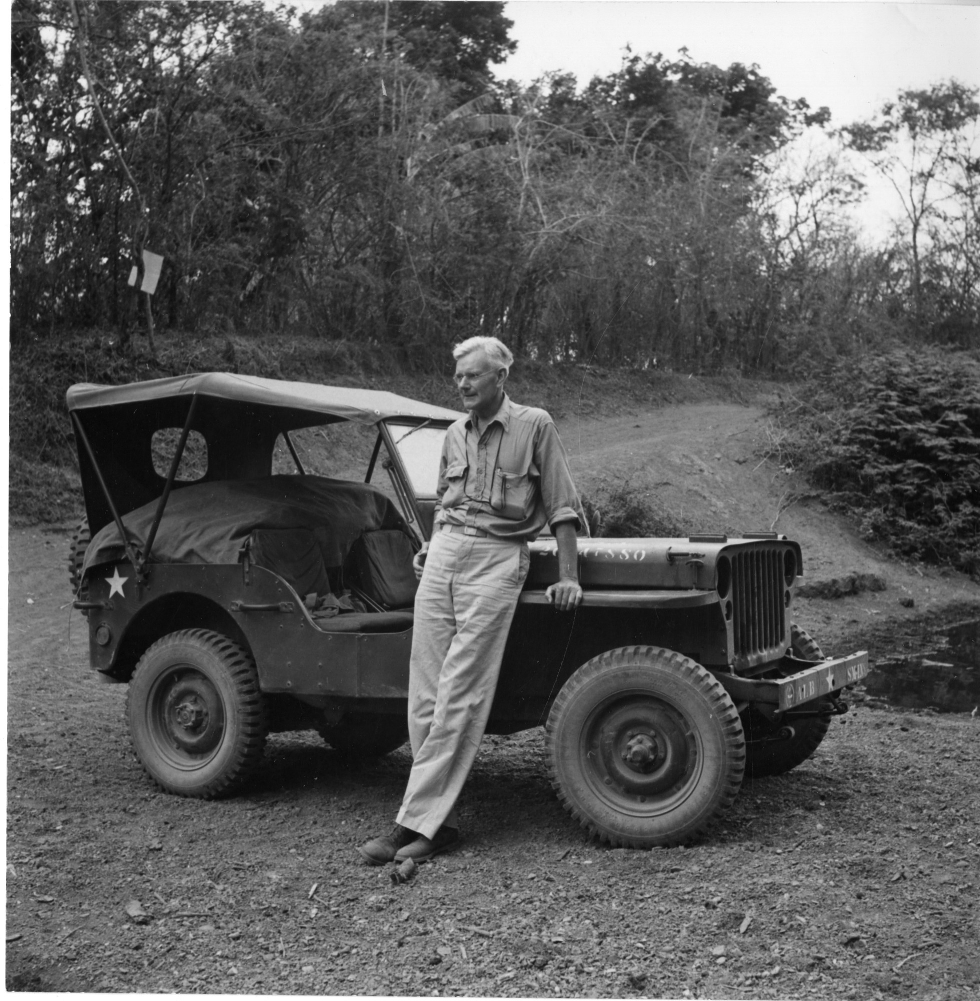 Alexander Wetmore, ornithologist and sixth Secretary of the Smithsonian, stands, leaning against a United States Army Air Force jeep at Rio Las Tablas, near Guarare, Los Santos, Panama.