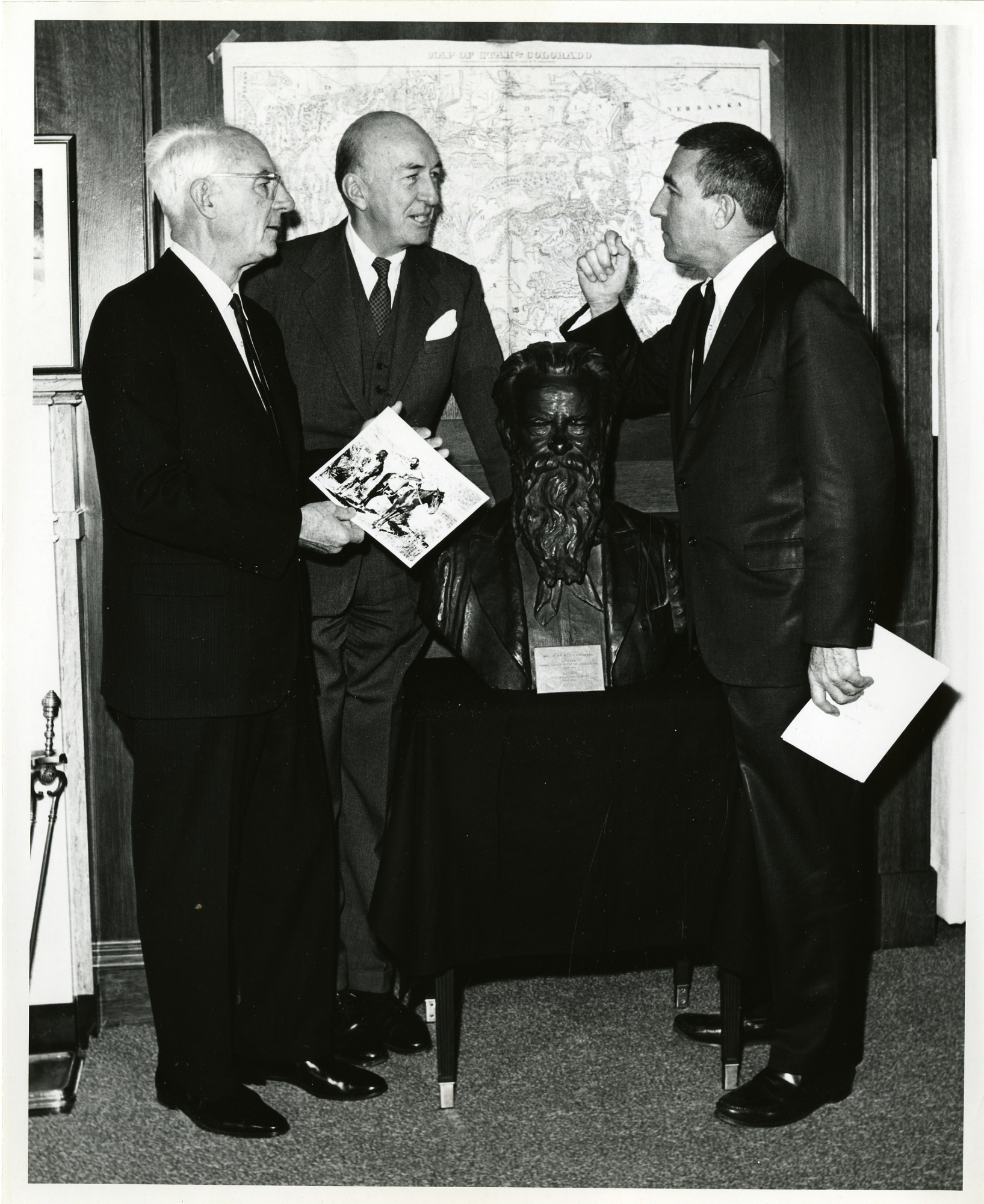 From l to r: Head of National Geographic Society Melville Bell Grosvenor, Eighth (1964-1984) Smithsonian Secretary S. Dillon Ripley and Secretary of the Interior (1960-1969) Stewart L. Udall. The photo appears to have been taken at the Department of Interior. The bust is of Alexander Graham Bell. Grosvenor is holding a photo of John Wesley Powell on horseback (See Neg. # 2002-10682 in this catalogue.) On the wall is a map of Colorado.