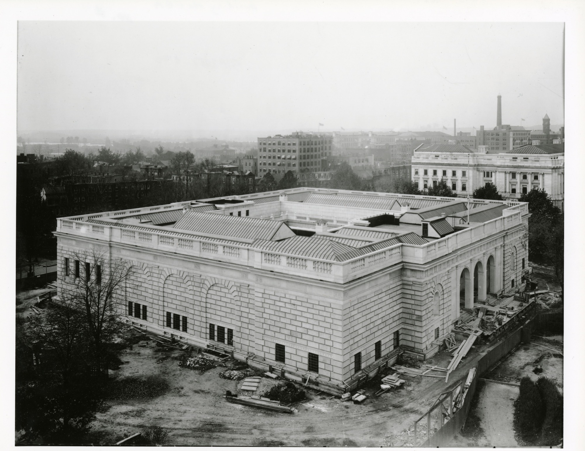 An aerial view of the north and east sides of the Freer Gallery of Art shows construction debris on the ground around the two sides of the new building. The Department of Agriculture building at the corner of Independence and 12th Street is to the west of the Gallery. In the distance on the left the Potomac River can be seen. Homes, other buildings, a smokestack and clock tower can also be seen