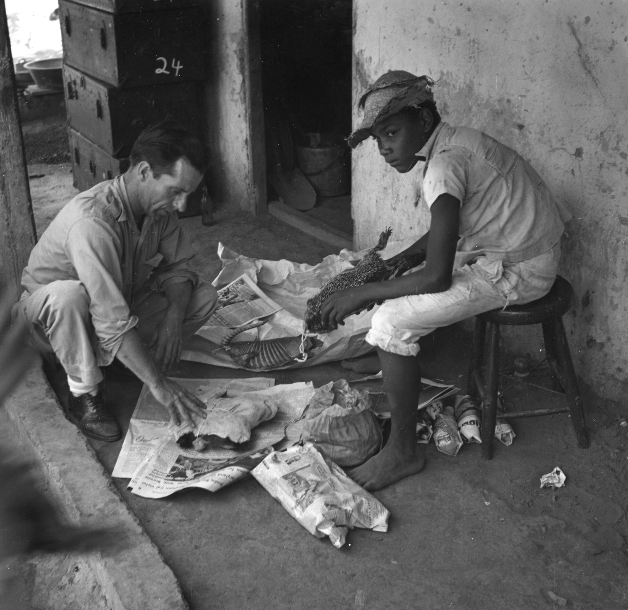 Image, taken by Alexander Wetmore, ornithologist and sixth Secretary of Smithsonian, during an ornithological field trip to Panama, shows Watson M. Perrygo, National Museum of Natural History taxidermist and field collector, packing salted mammal skins in newspapers with the assistance of Eumenio, a young boy, in Parita, Herrera, Panama. Perrygo accompanied Alexander Wetmore on his trips to collect specimens and conduct ornithological field work.