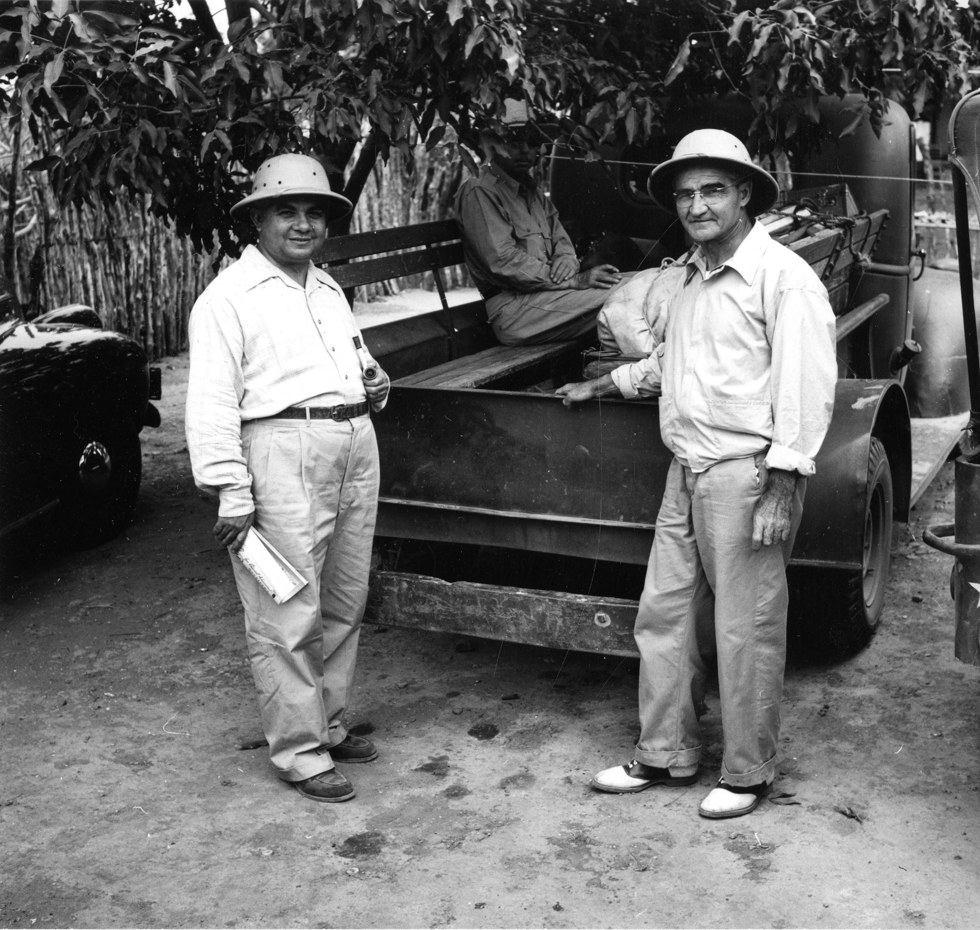 Image is of Max Arosemena, former Ministro Departamento de Educatión, and Alejandro Mendez, Direcor of the Museo Nacional, in Parita, Herrera, Panama. The two men are pictured by the tailgate of a truck. A man is seated on one of two benches in the truck's cargo area. Taken by Alexander Wetmore, ornithologist and Sixth Secretary of Smithsonian, during an ornithological field trip to Panama.