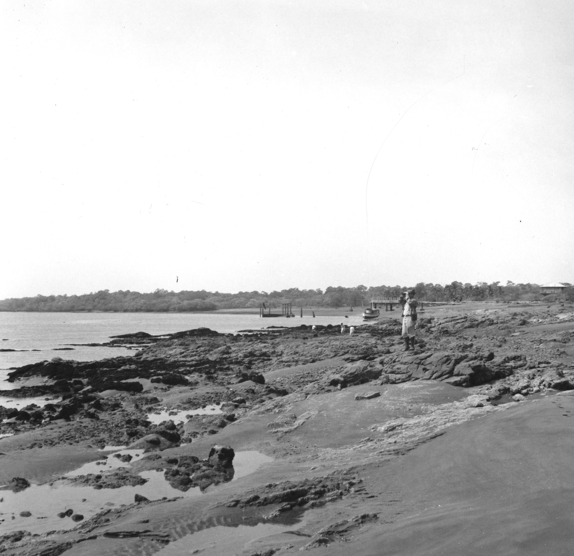 At the mouth of Río Mensabé in Puerto Mensabé, Los Santos, Panama, a man, possibly Watson M. Perrygo, is using binoculars. A boat can be seen pulled up on the shore and three people can be seen along the Río Mensabé. Image taken by Alexander Wetmore, ornithologist and sixth Secretary of Smithsonian, during an ornithological field trip to Panama.