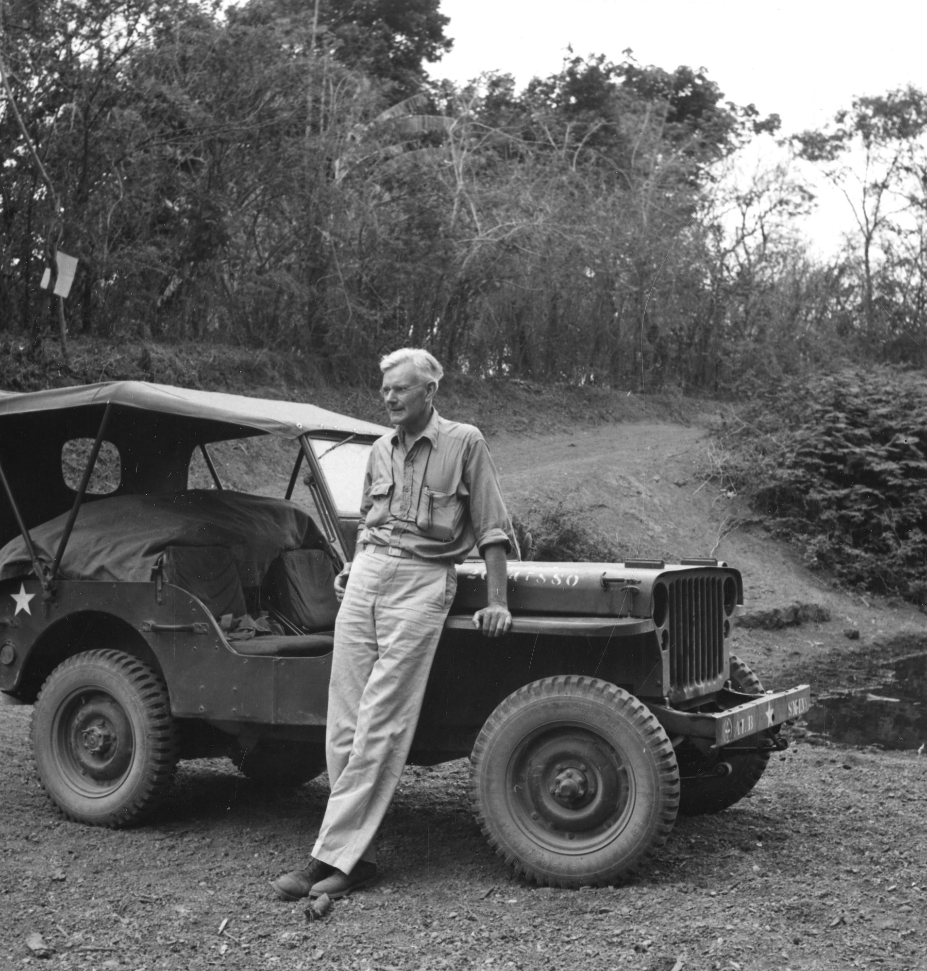 Image of Alexander Wetmore leaning against the side of an Army Air Force jeep. Wetmore is in Rió Las Tablas, near Guararé, Los Santos, Panama. Taken by an unknown photographer of Alexander Wetmore, ornithologist and sixth Secretary of Smithsonian, during an ornithological field trip to Panama.