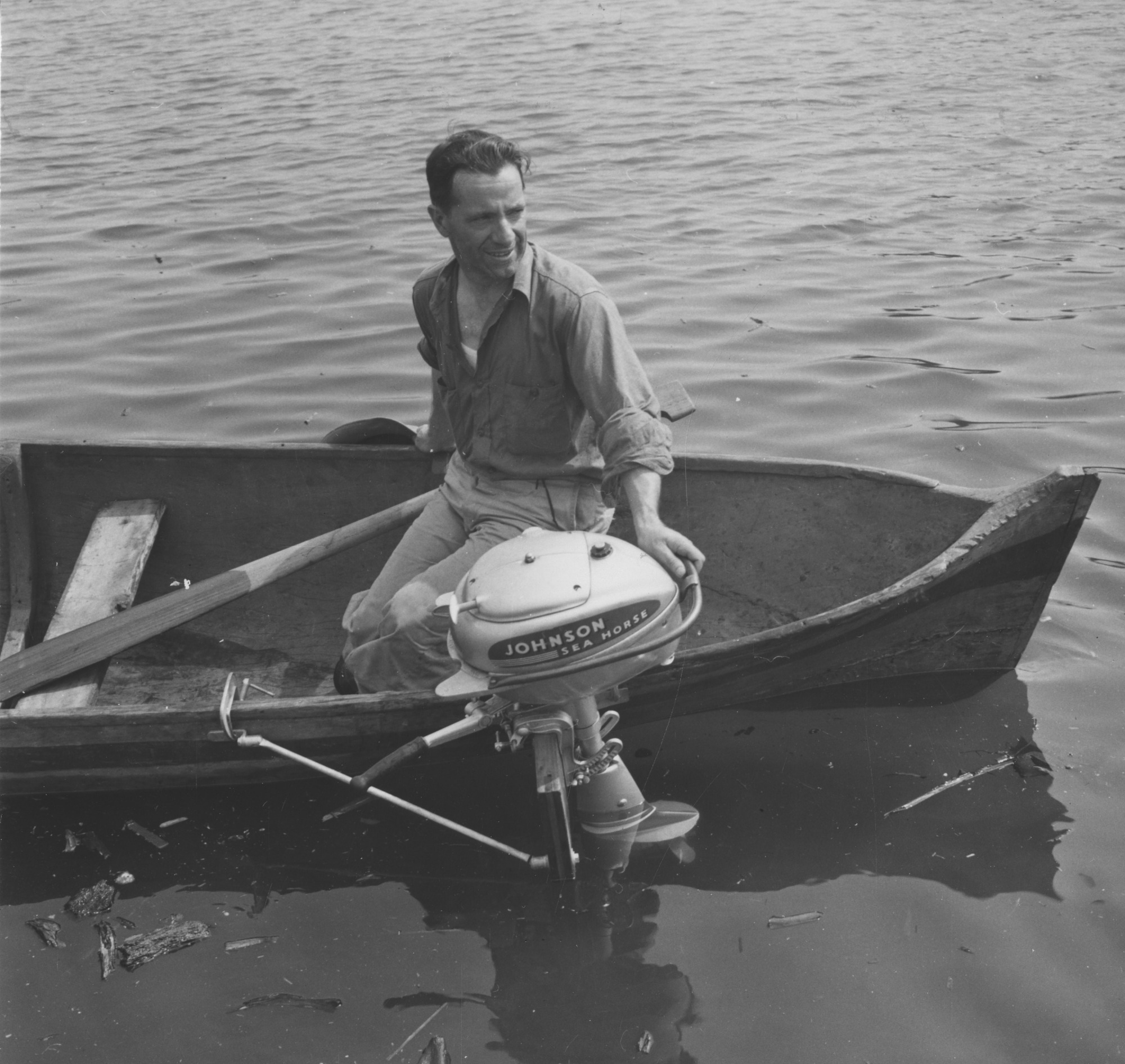 Watson M. Perrygo, taxidermist at the United States National Museum, now the National Museum of Natural History (NMNH), sits in a boat, outfitted with an outboard motor, used to travel up the Río Indio, Panama. Perrygo, taxidermist, served as exhibits preparator and zoological exhibits worker in the Department of Zoology, USNM, accompanied Alexander Wetmore (1886-1978), ornithologist and sixth Secretary (1944-1952) of the Smithsonian, on numerous bird specimen collecting trips to Panama.The image was taken by Wetmore during their 1952 ornithological field trip to Panama.