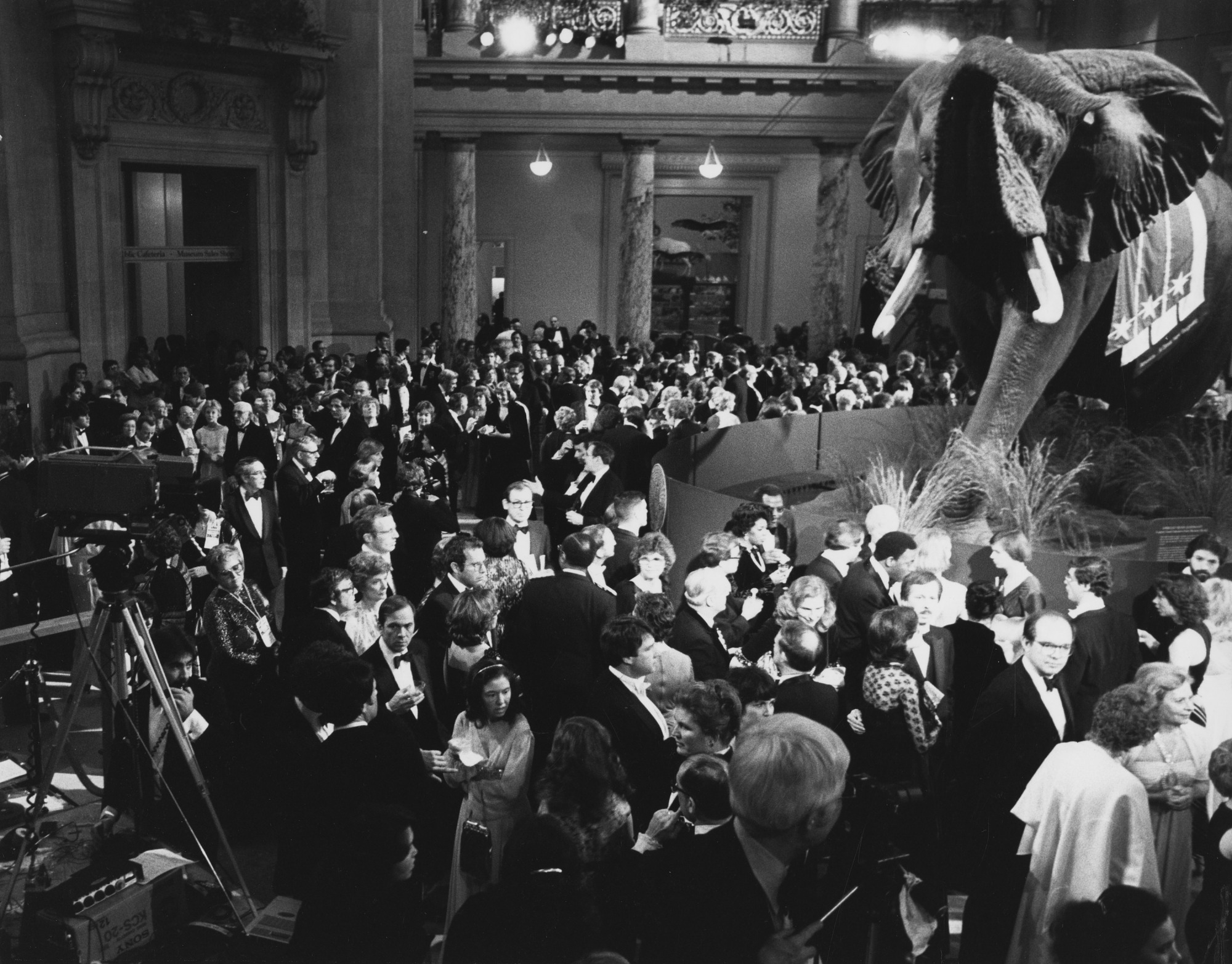 Party goers attending President Ronald Reagan's Inaugural Ball at the National Museum of Natural History fill the rotunda The Fénykövi Elephant facing forward is in the center of the rotunda.