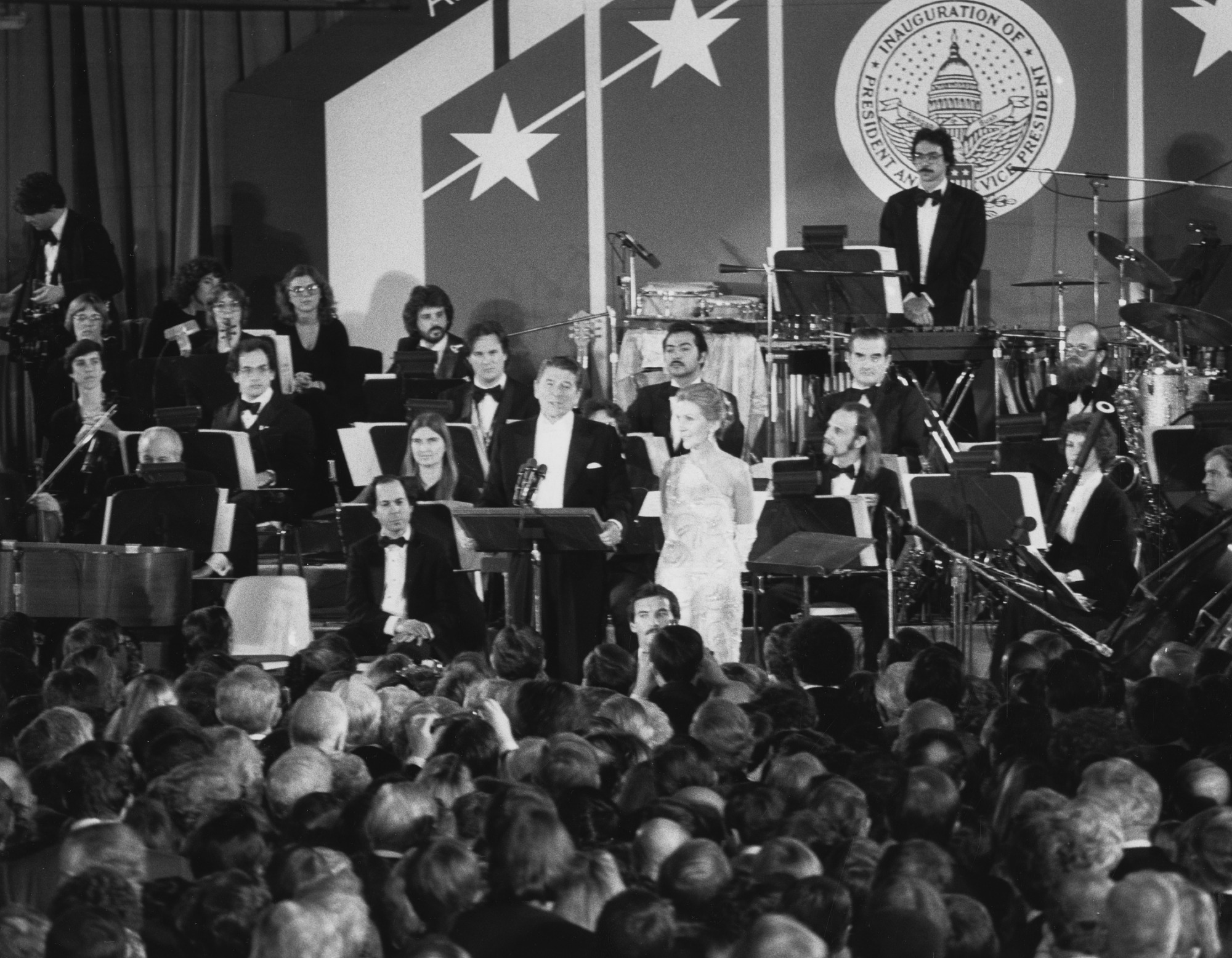 President Ronald Reagan is speaking to the crowd at one of his Inaugural Balls. Reagan is standing at a podium and Nancy Reagan is standing on his left. Behind the President and the First Lady is the band.
