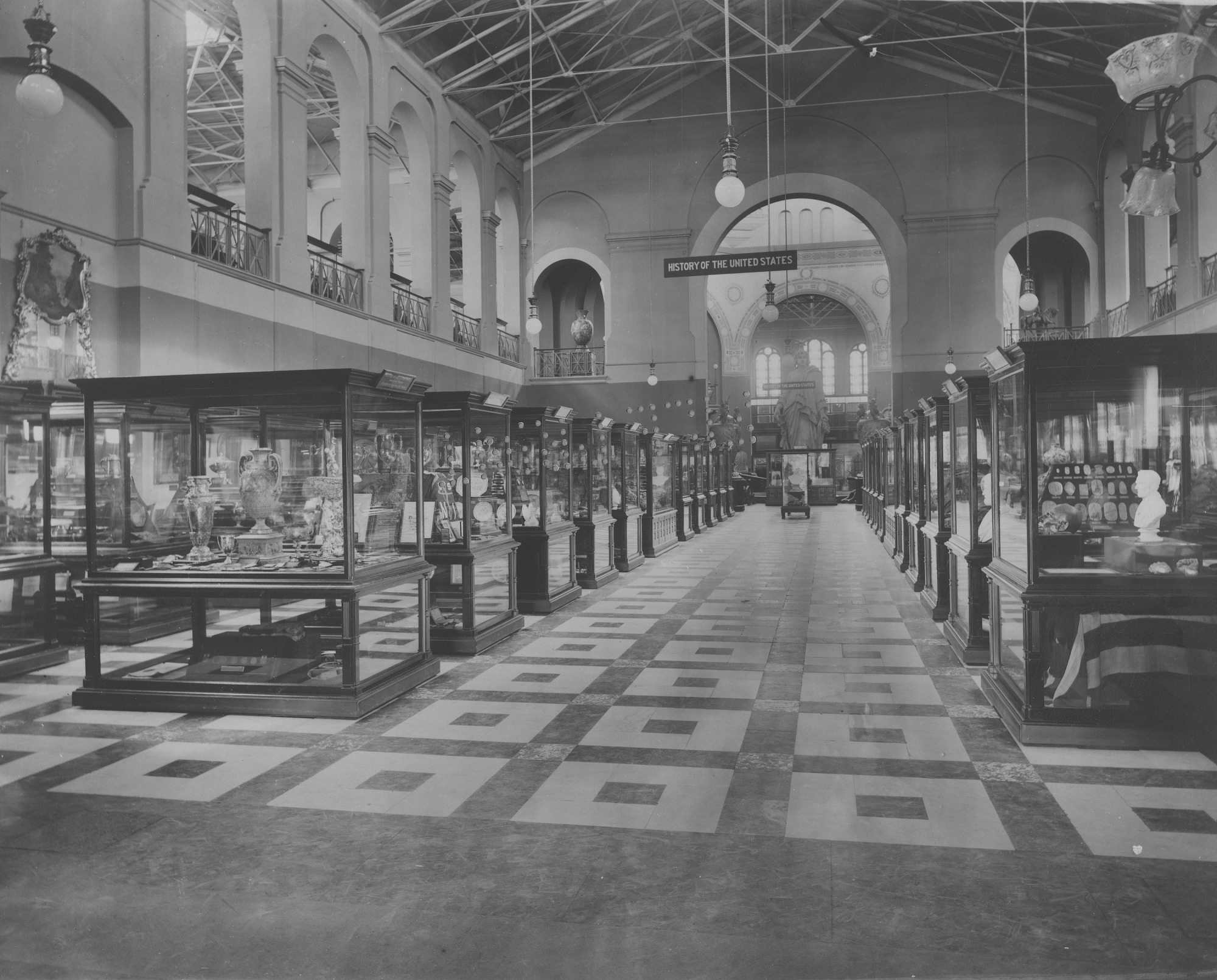 A sign "History of the United States" hangs over exhibit cases in the North Hall of the United States National Museum, now known as the Arts and Industries Building. Cases on the left hold decorative vases and other decorative art objects. In the first case on the right, the top level holds a bust of Abraham Lincoln and other artifacts. A flag-draped object is below. At the far end of the hall is the "Statue of Freedom." in the rotunda The railings to the galleries on the second floor completed in 1903 are in the upper right and left.