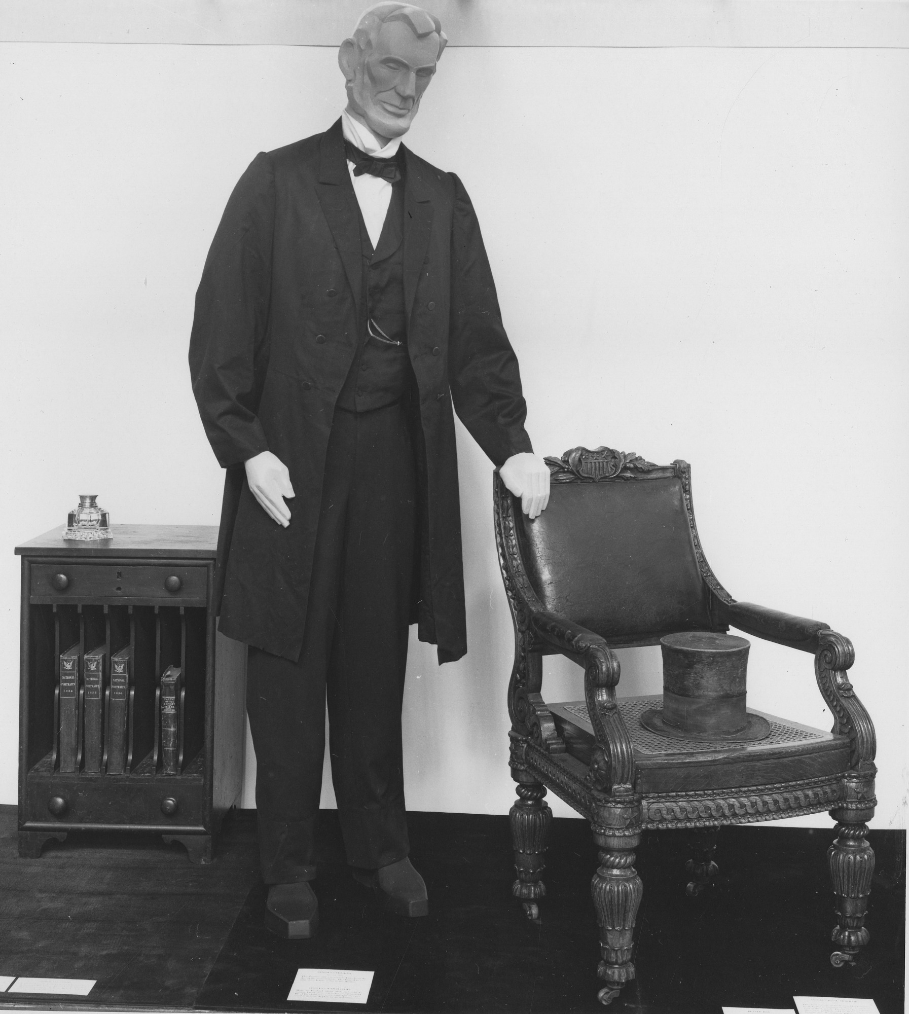 Exhibit in the Arts and Industries Building in 1959 celebrated the 150th anniversary of the birth of President Abraham Lincoln. A mannequin wears President Lincoln's suit. The mannequin of Lincoln has his left hand resting on a chair and his top hat is on the seat of the chair. A cabinet to his right holds some books and an inkwell sits on top.