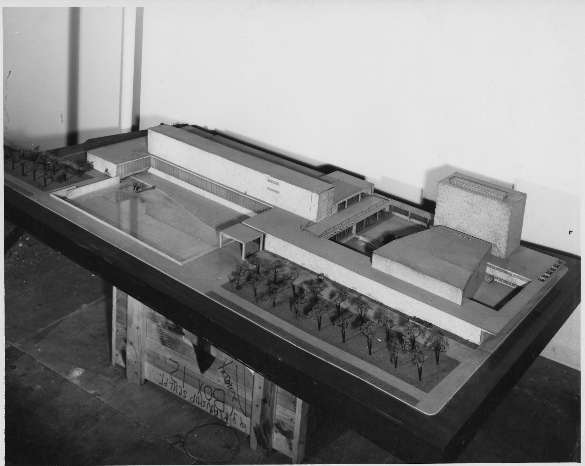 A model of the proposed National Gallery of Art designed by Eero Saarinen. This is the front side of the building. Funding was never secured for the new museum. The building would have housed the collection of what is now the Smithsonian American Art Museum.