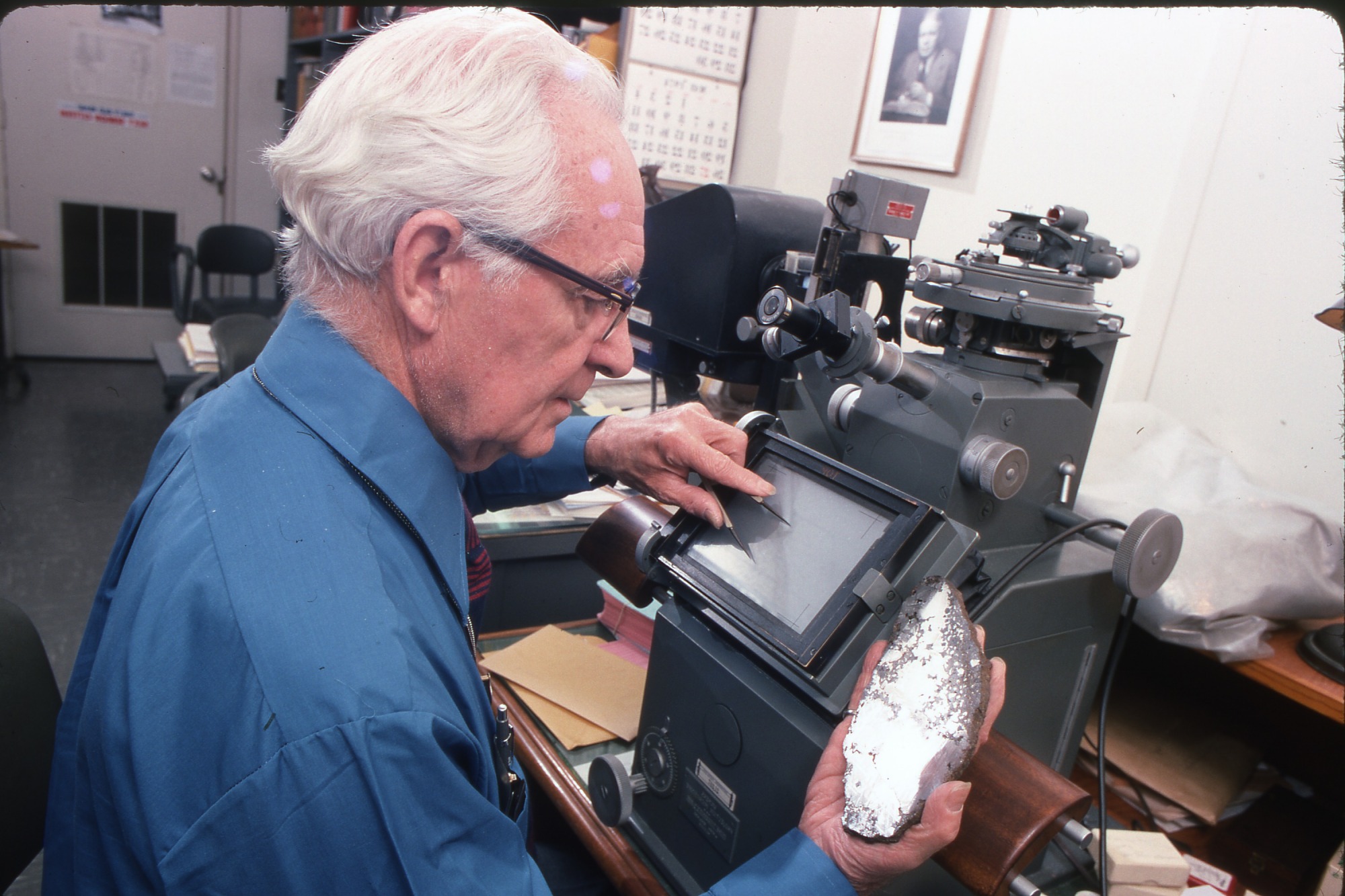 For additional photos of Henderson examining meteorites, see Negatives SIA2013-03962, SIA2013-03963, and SIA2013-03964.,