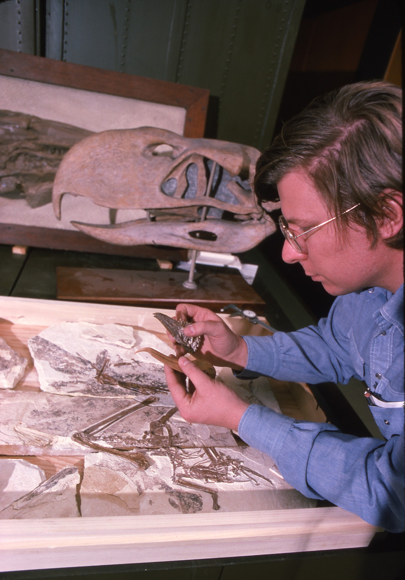 Storrs Olson, paleobiologist and ornithologist, holds a specimen in his hands while working in the National Museum of Natural History. To his right is a skull mounted on a rod.