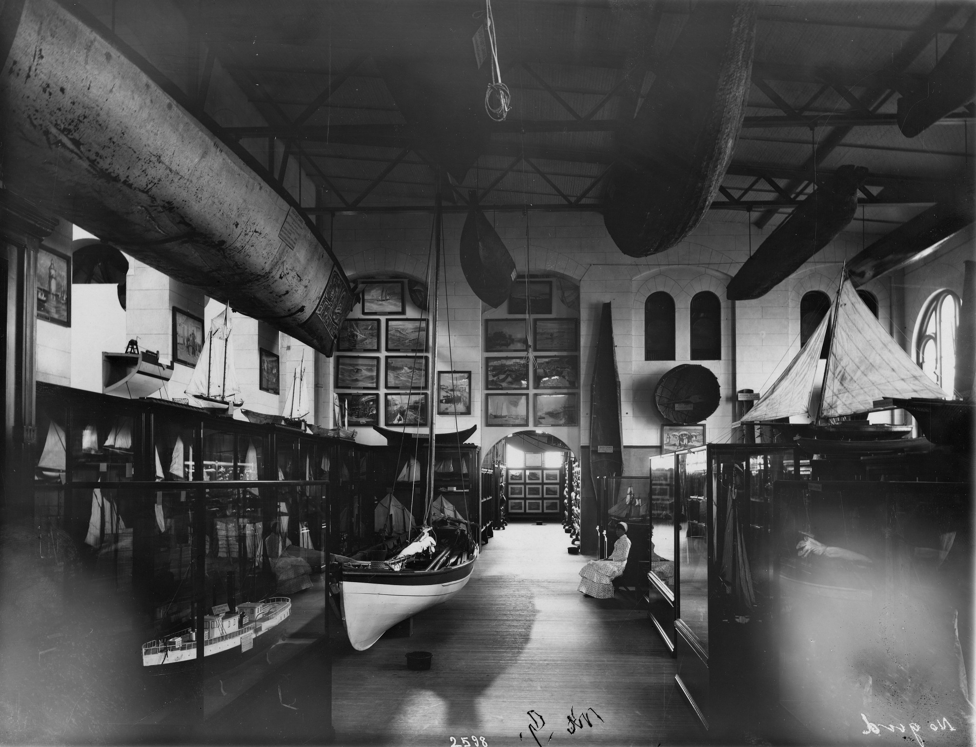 The Hall of Water Transportation, also known as "Boat Hall," United States National Museum, now known as Arts and Industries Building, contains exhibit cases holding ship models. Also, there are more ship models on top of the cases. Canoes are hung from the ceiling and one is also on the floor. In the hall, a female attendant dressed in white is seated. Nautical pictures are hung on the wall.