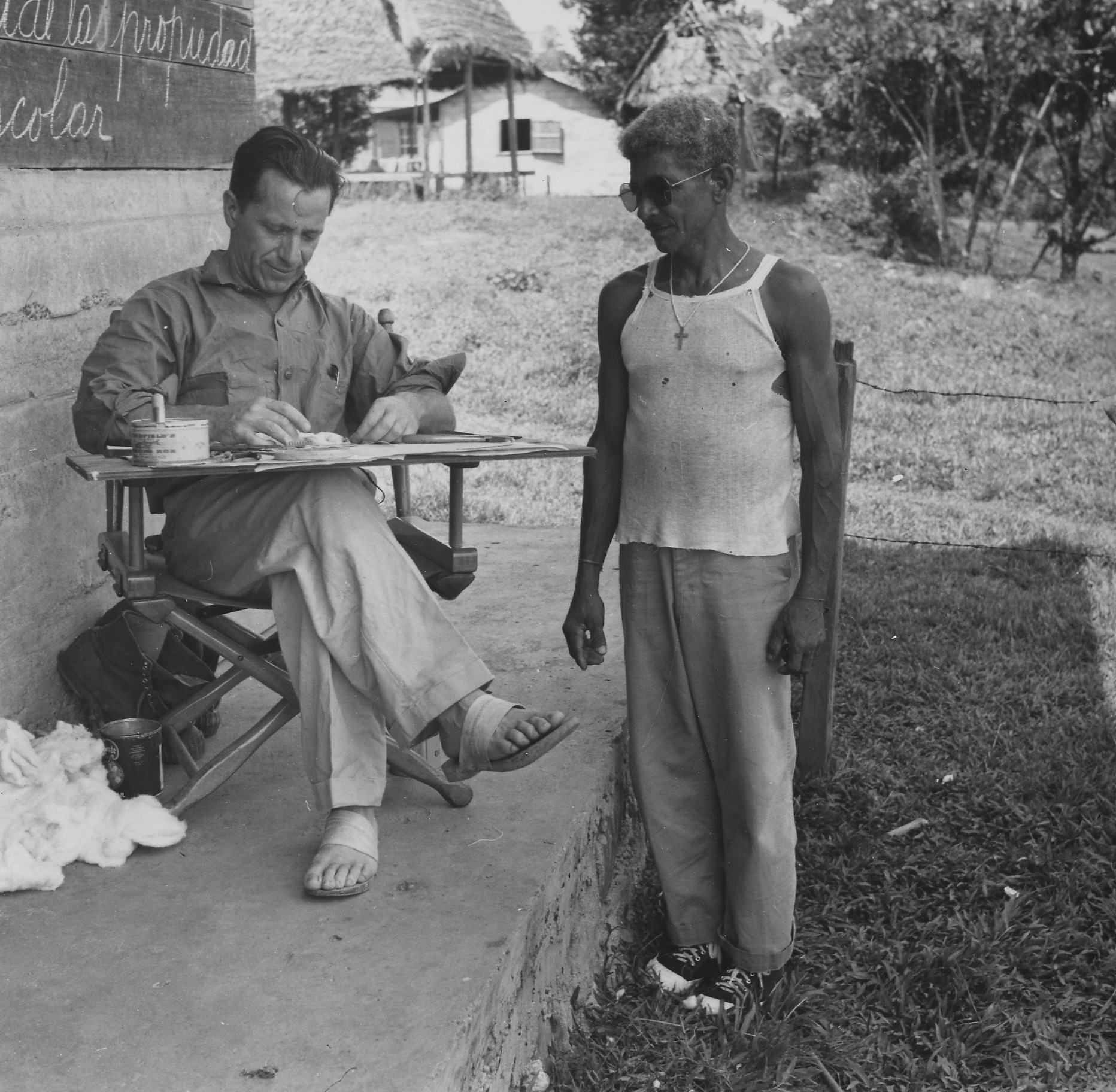 In El Uracillo, Coclé, Panama, Demetrio Saladino, a Panamanian man watches Watson M. Perrygo, who is seated at a table, wrap a bird. Perrygo, a taxidermist with the National Museum of Natural History, was in Panama on an ornithological field trip.