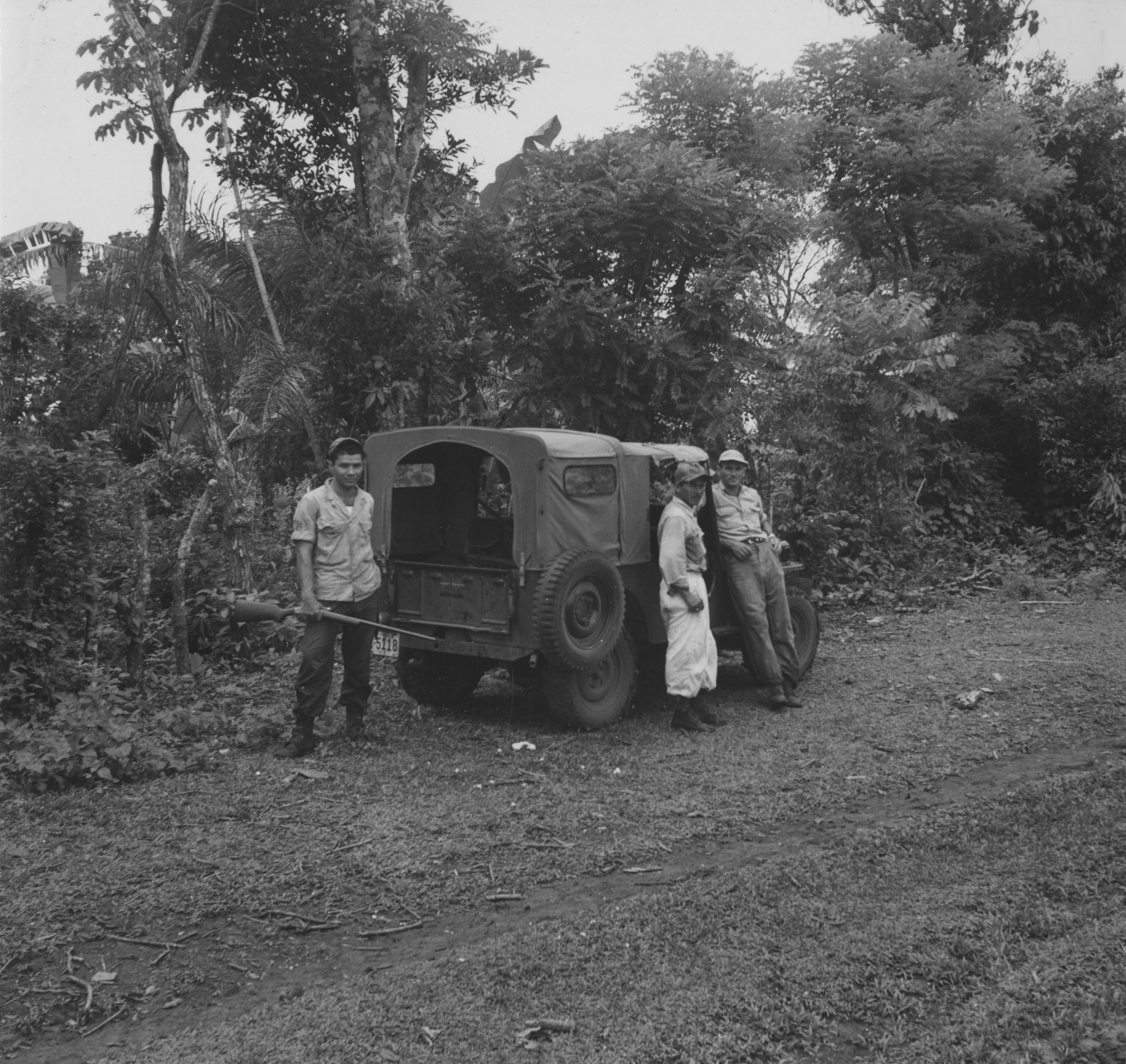 Image of Antonio Moreno, Pantaleón Sánchez, Helmut Hils [left to right] in Río de Jesús, Veraguas, Panama. The three men are standing by an Army jeep. The image was taken by Smithsonian Secretary Alexander Wetmore on May 22, 1953, during an ornithological expedition to Panama. The three men assisted Wetmore on his expedition.
