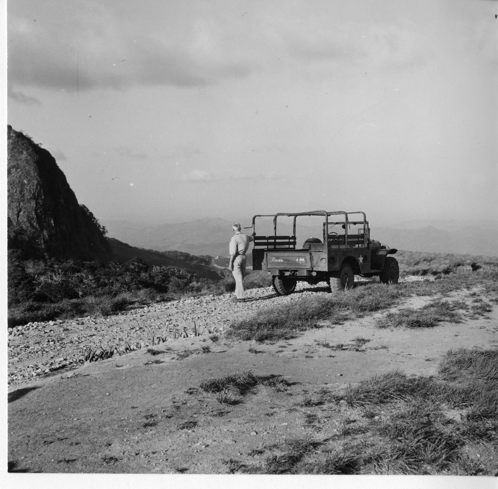 Photograph showing Smithsonian Secretary Alexander Wetmore standing against a jeep in Cerro Campana, Panama.The image was taken during Wetmore's ornithological expedition to Panama on March 11, 1951. Wetmore and the vehicle stand on a dirt road overlooking a series of valleys in Panama. Wetmore's back is to the camera.