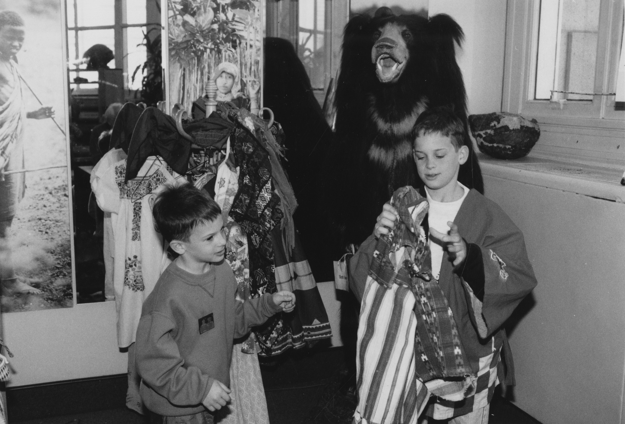 Two children holding costumes for a costume party held at the National Museum of Natural History's Discovery Zone. A bear specimen is behind the boys.