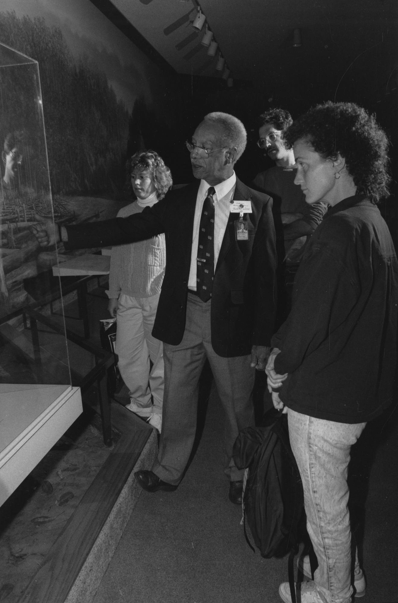 Fletcher Wood, a volunteer docent for the National Museum of Natural History, explains a display to visitors.