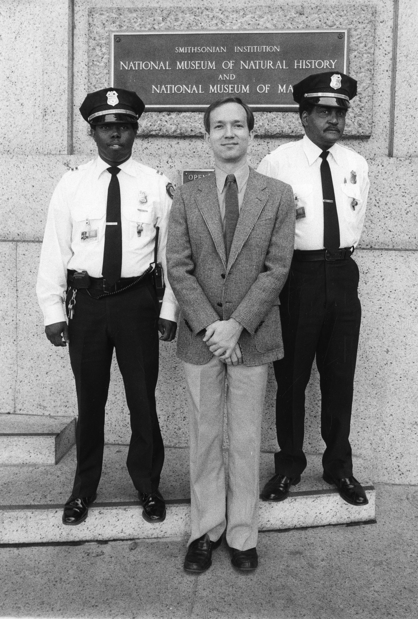 Crime stoppers [left to right] James Burford, Anthony Pineau, and Raymond Watson. On September 19, 1981, an ex-clerk with Smithsonian Museum shops, armed with a .25 caliber automatic pistol attempted to steal more than $2,500 from the National Museum of Natural History's shop. The thief walked in on shop employees Anthony Pineau, Mary Heiss and Thrynn Kirby and took money out of the register drawers. After he left, Pineau pushed a security button and called the security office. Lt. Raymond Watson with the assistance of Capt. James Burford apprehended the thief at the Constitution Avenue doorway.