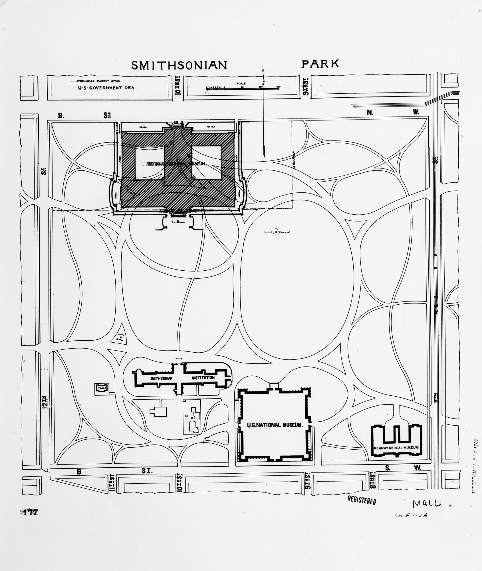 Print of the original architectural drawing for the new National Museum of Natural History's location on the National Mall. The Smithsonian Institution Building, or the Castle, the original United States National Museum, now known as the Arts and Industries Building, and the United States Army Medical Museum can also be seen on the plan. The original drawing was done in ink pen on tracing cloth, circa 1903 by architects Hornblower and Marshall. The image has an inscribed title of "Plan Showing Location of New National Museum on the Mall." The plan is also called Smithsonian Park. The original drawing measures 28.00" x 26.25". The Creator Drawing Number associated with this drawing is USNM Tracing #177, sheet 2 of 2, and the Drawing Control Number associated with this drawing is S04/I414.