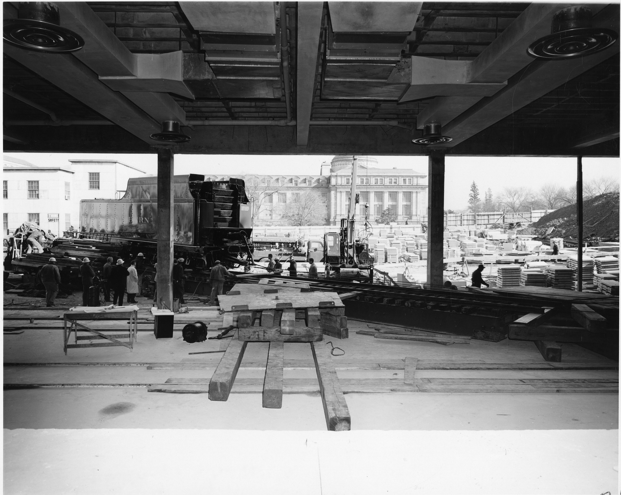 The Southern Railroad car arrives at the new Museum of History and Technology, now the National Museum of American History. The car arrives while the museum is still under construction. Looking out though the unfinished Railroad Hall, the Southern Railroad car can be seen on tracks which have been laid into the hall, and some workmen are to the right and left of the train. Wooden planks and other construction materials are laying in front of the tracks. In the background the part of the dome and the west side of the National Museum of Natural History Building are visible.