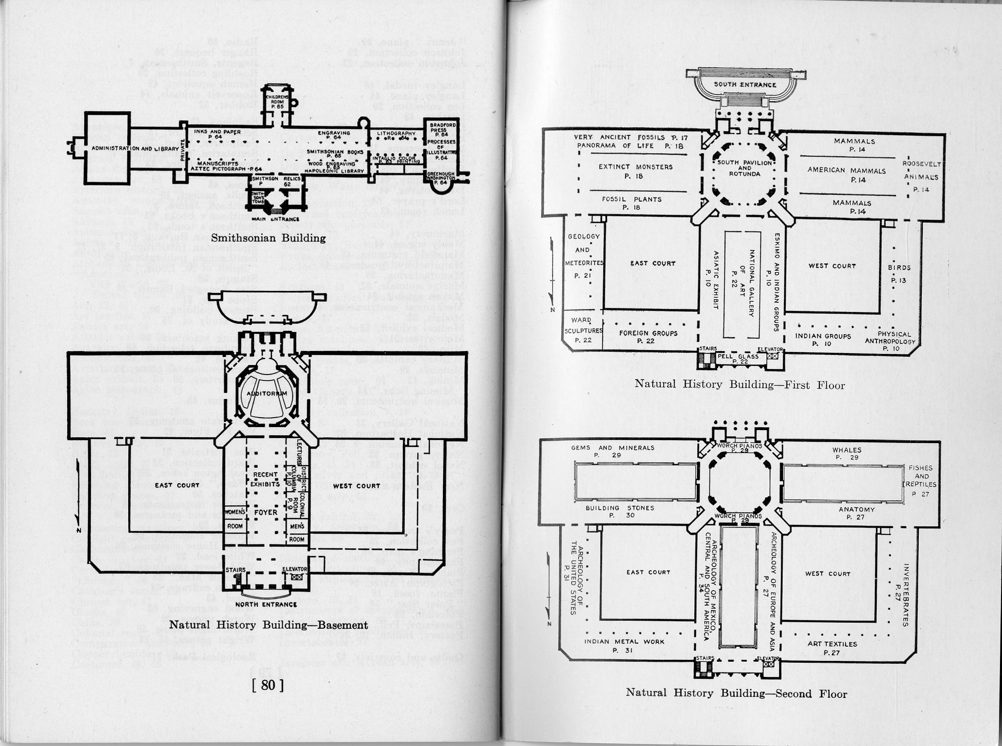 A page from the Brief Guide to the Smithsonian Institution shows the first floor plan of the Smithsonian Building ("the Castle") with the location of various exhibits and the basement, first floor, and second floor plan of the Natural History Building, now known as the National Museum of Natural History, with the locations of exhibits on each floor.
