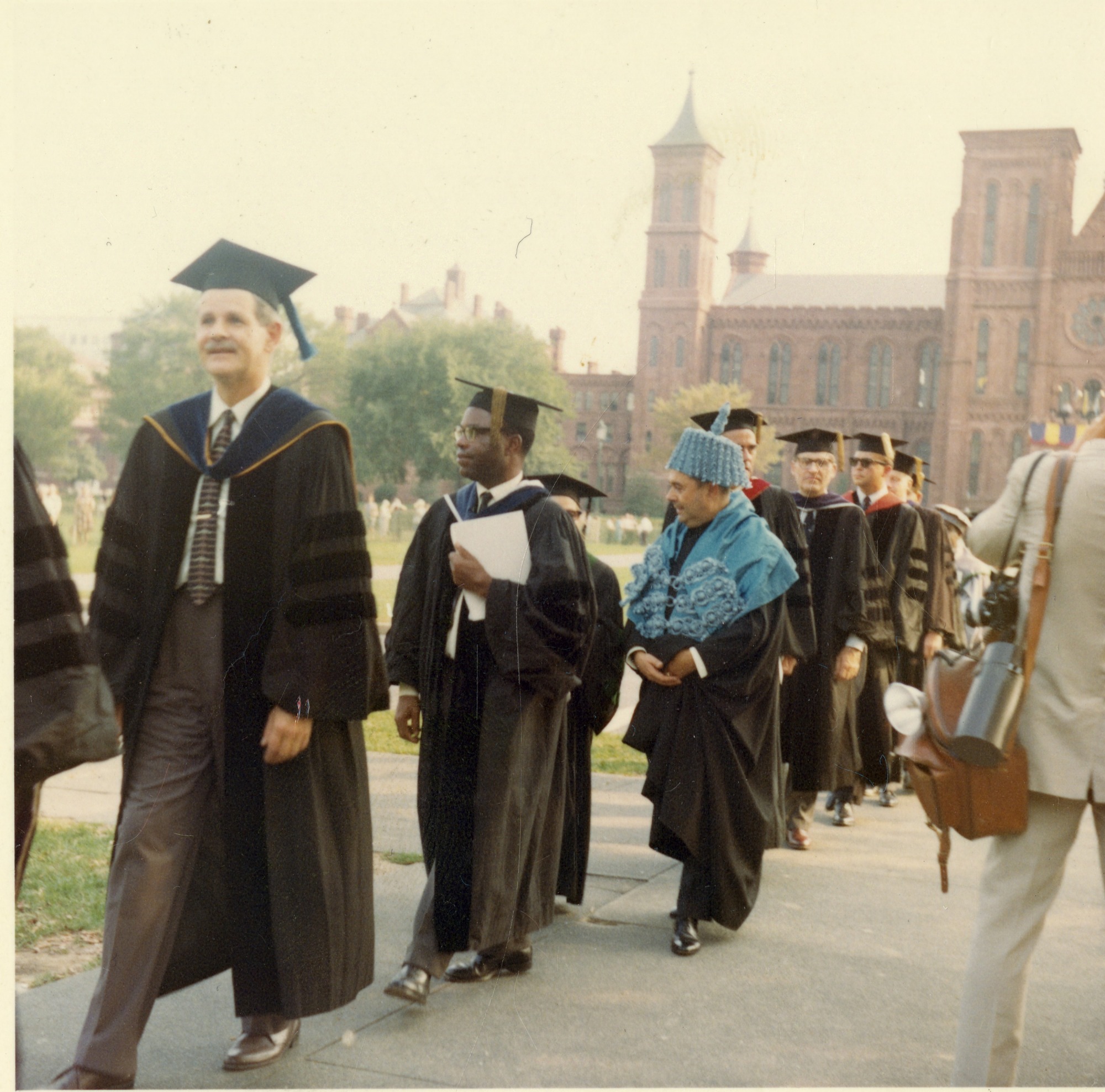 To commemorate the 200th anniversary of the birth of James Smithson, founding donor of the Smithsonian Institution, a three day celebration was held September 16, 17, 18, 1965. The event included an academic procession. The procession, some of whom are shown here going across the Mall, included leaders, who are dressed in their academic robes, from the fields of the sciences and the humanities. The east wing of the Smithsonian Castle is visible in the background.