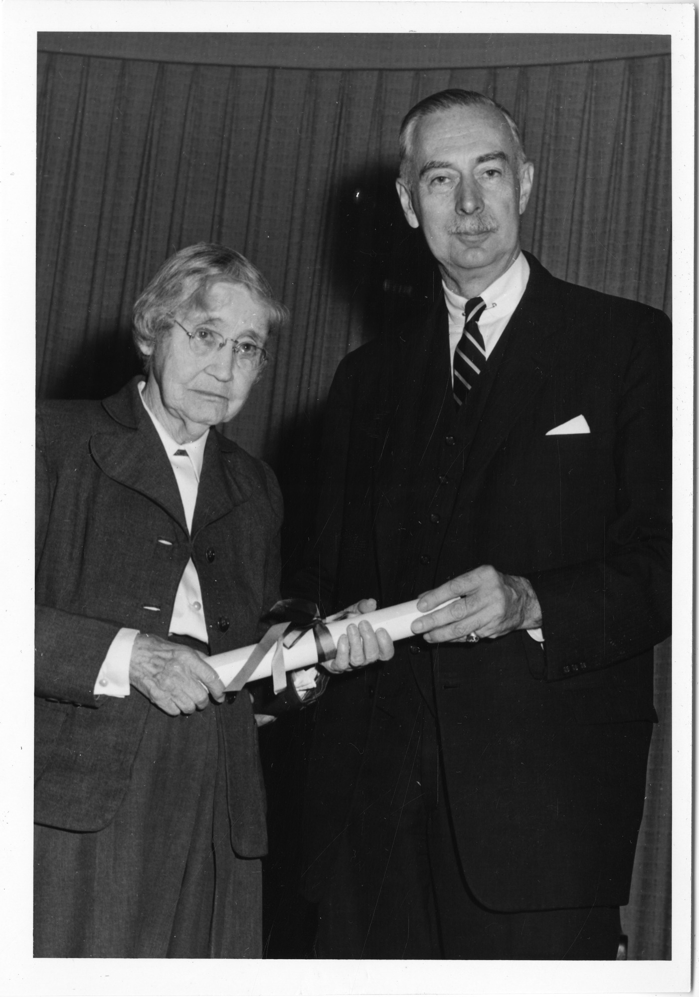 Curator of Grasses Agnes Chase receives an award from Smithsonian Secretary Leonard Carmichael. Agnes Chase (1869-1963) was Honorary Curator of the United States National Herbarium at the Smithsonian Institution and Botanist at the United States Department of Agriculture. Chase specialized in the study of grasses and conducted extensive field work in South America.