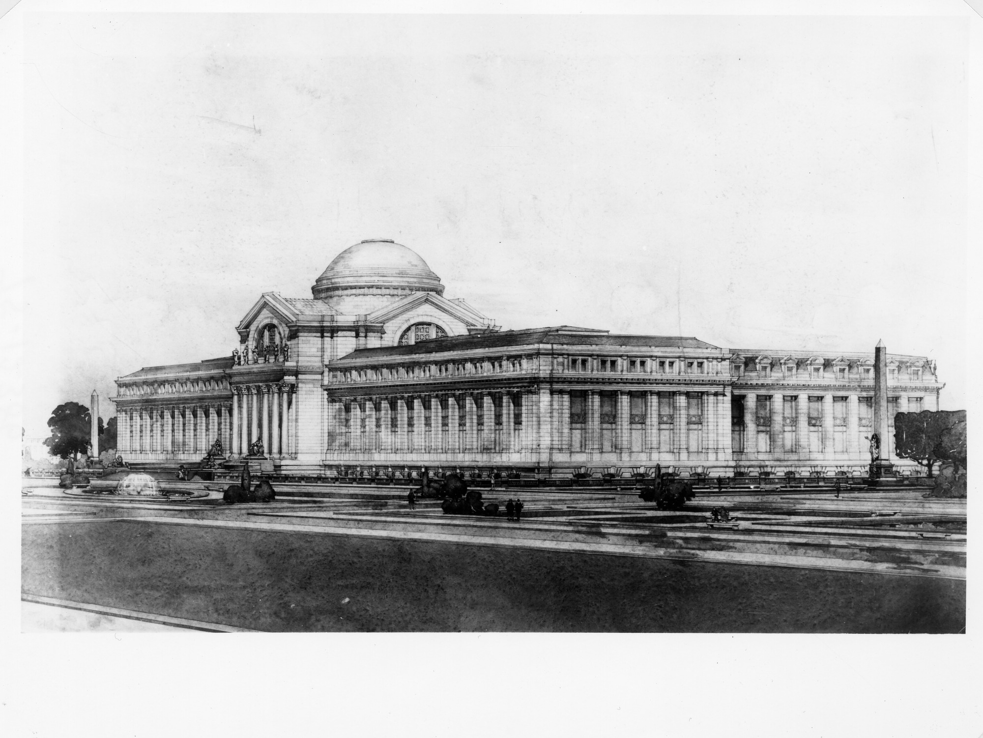 Architectural drawing of the south front of the United States National Museum, now known as the National Museum of Natural History, by J.C. Hornblower and J. R. Marshall. The image is titled "Rendering on South Front and Surroundings." The original is 21.00"h x 28.25"w.