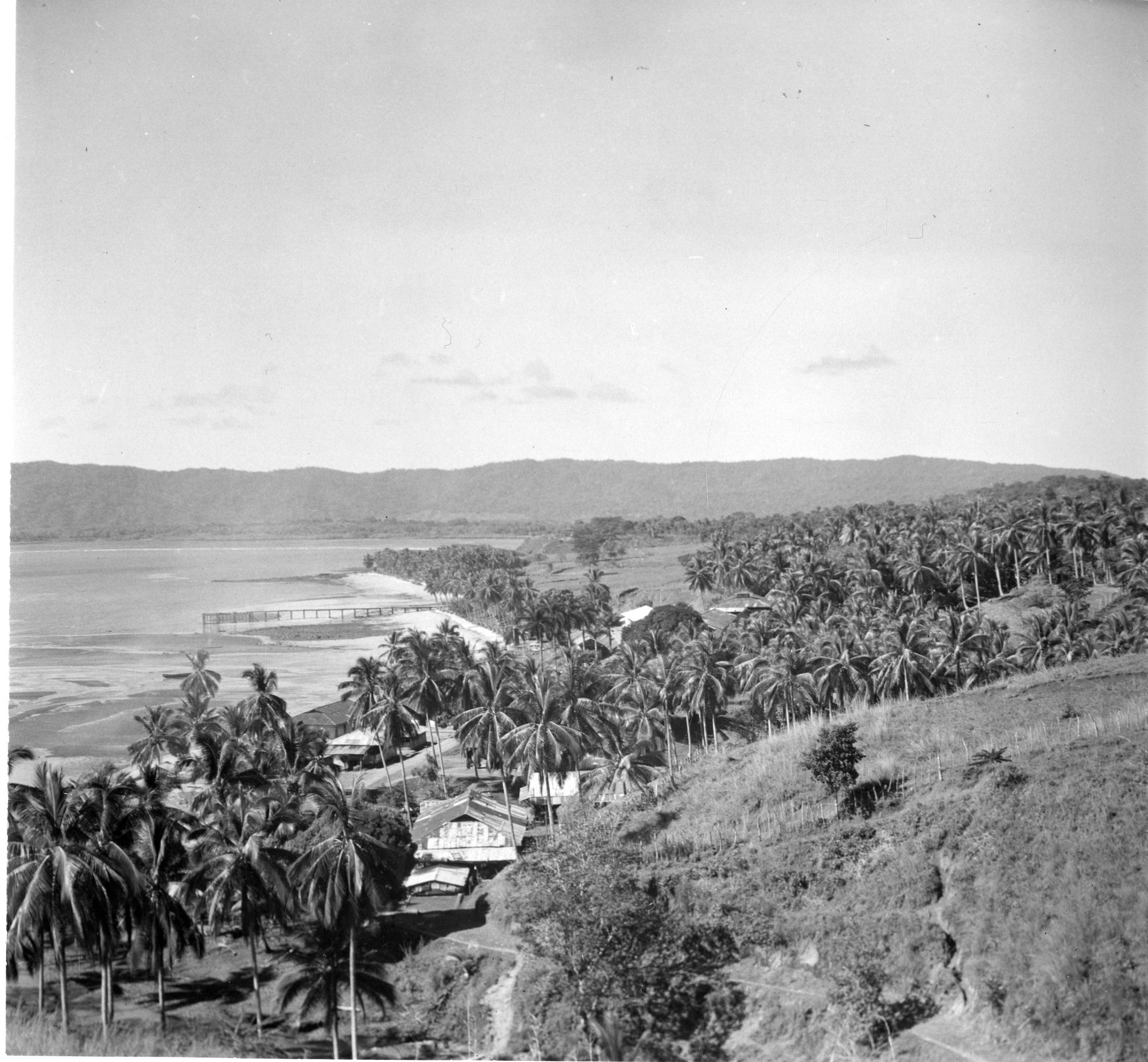 La Central, Colonia Penal, Coiba Island from the head of the Punta Damas trail on January 13, 1956. An expanse of palm trees sweeps diagonally across the image. Amongst the palm trees are many buildings. The beach and shoreline, including a dock, are visible, and there are mountains in the distance. There is a grassy area in the foreground.