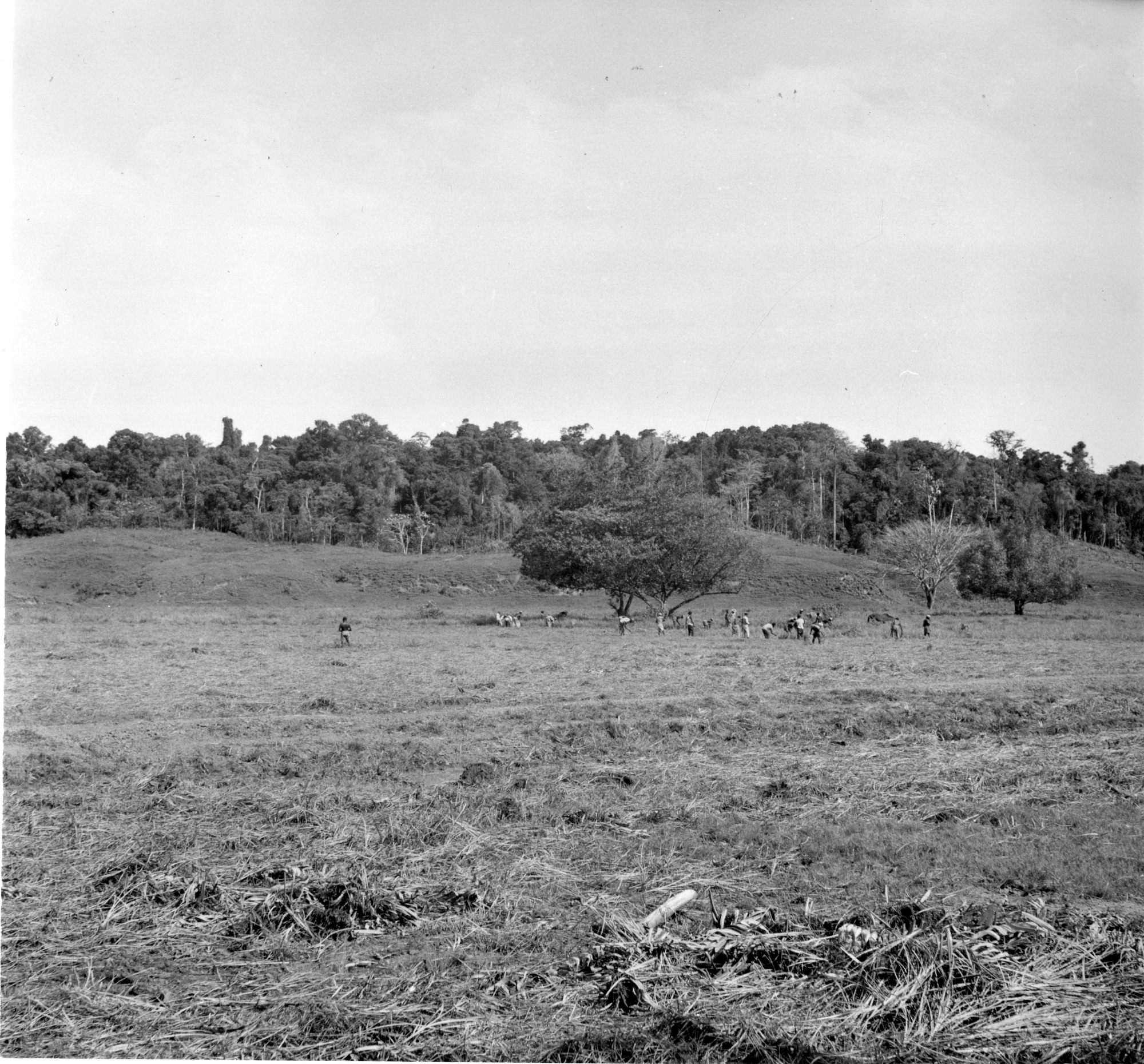 Convict work gang at Catival, Coiba Island, Panama on January 11, 1956. The convicts are working in a grassy field with a few trees. There is a tree-lined ridge behind them.