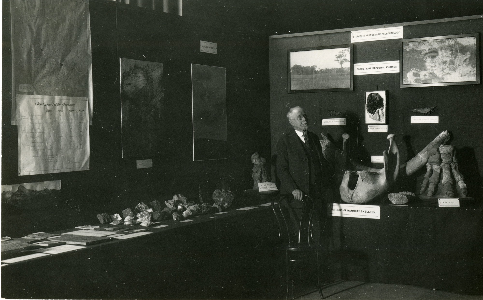 Physical and Chemical Geology Exhibit at the Conference on the Future of the Smithsonian, February 11, 1927, with George P. Merrill (1854-1929), Curator, standing with his hand on the back of chair in front of the exhibit. Behind him laid out on a table are different types of mineral specimens. To his left is the Vertebrate Paleontology Exhibit. The exhibits were located in the Smithsonian Institution Building or "Castle." Merrill was a geologist and head curator of the Department of Geology, United States National Museum from 1917-1929.