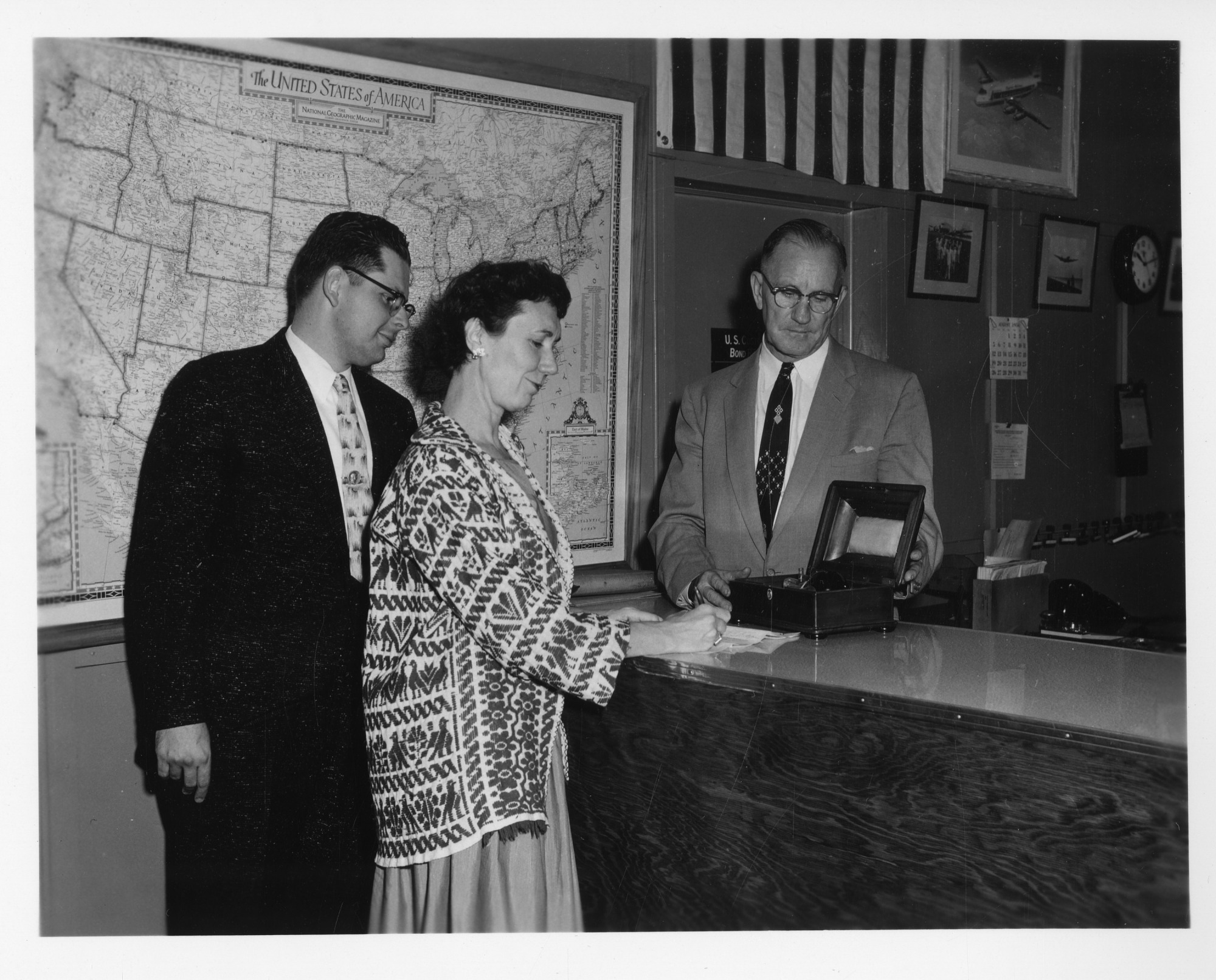 Helena Weiss (Chief, Division of Correspondence and Documents, 1948-1956, Registrar, Office of the Registrar, 1956-1971), signs paperwork during the presentation of the Roentgen X-ray tube. George B. Griffenhagen, curator of the Division of Medicine and Public Health, stands to Weiss' left and a man identified only as Bane stands on the other side of the desk.
