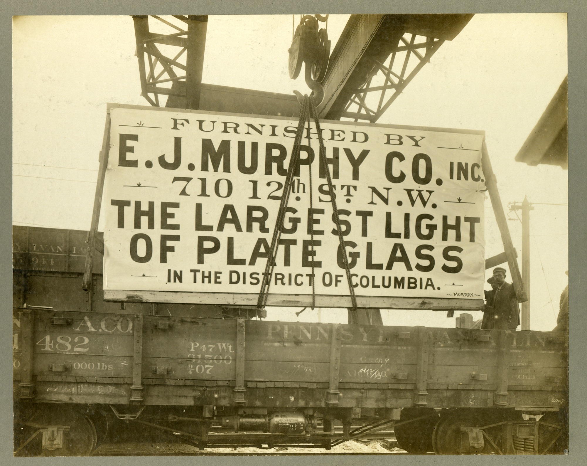 Laborers stand on a railcar as plate glass from the E. J. Murphy Co. (as evidenced by a large sign) is being raised by a crane. The plate glass is to be installed at the nearly completed Natural History Building. The new United States National Museum, now known as the National Museum of Natural History, opened on March 17, 1910 housing the Smithsonian Institution's natural history, art, culture, and history collections.
